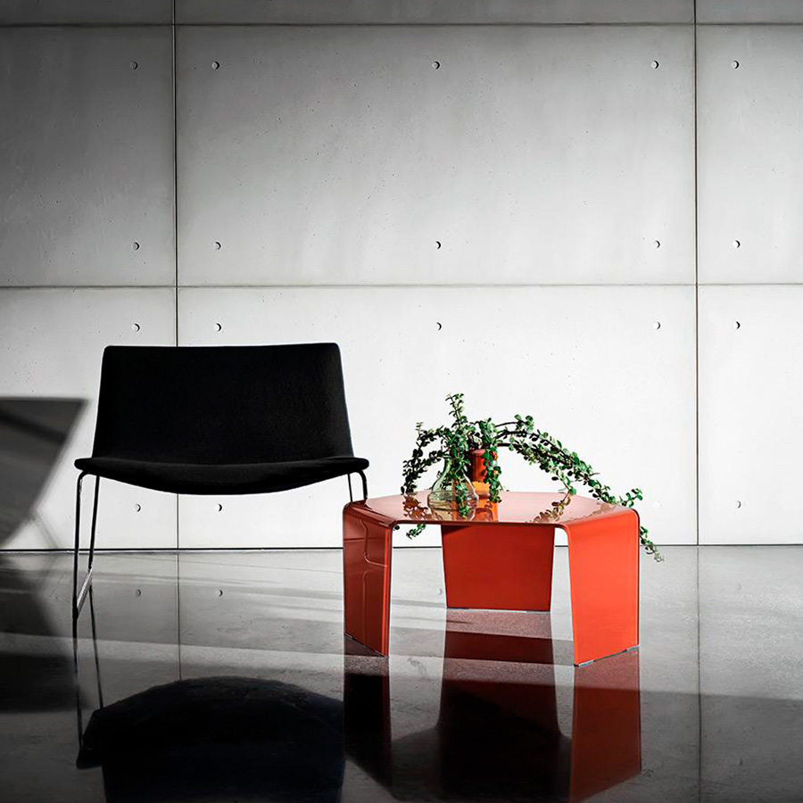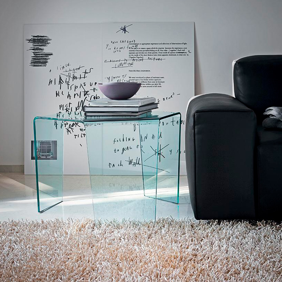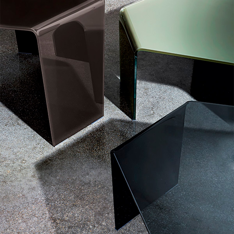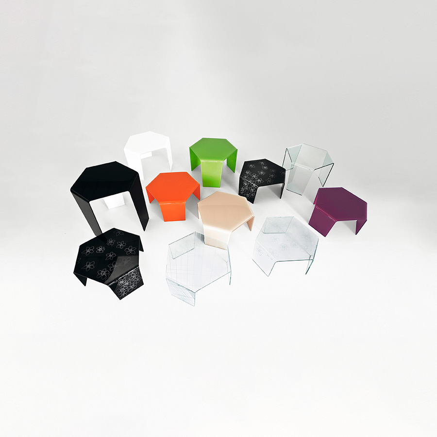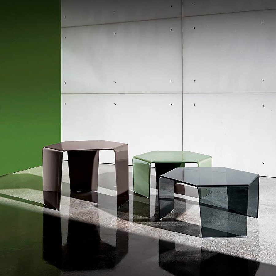 3 Feet is a collection of hexagonal coffee tables made of bent glass, capable of giving the home a lively touch of originality. They can be put together by playing with the different heights and finishes.