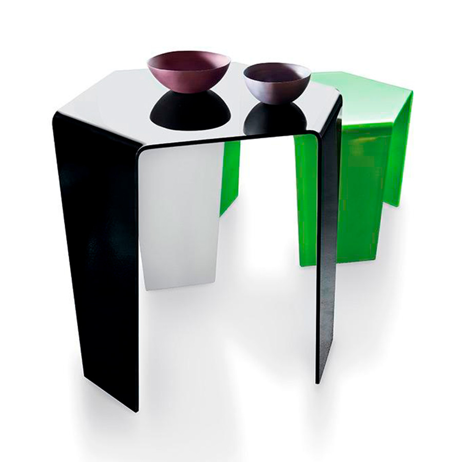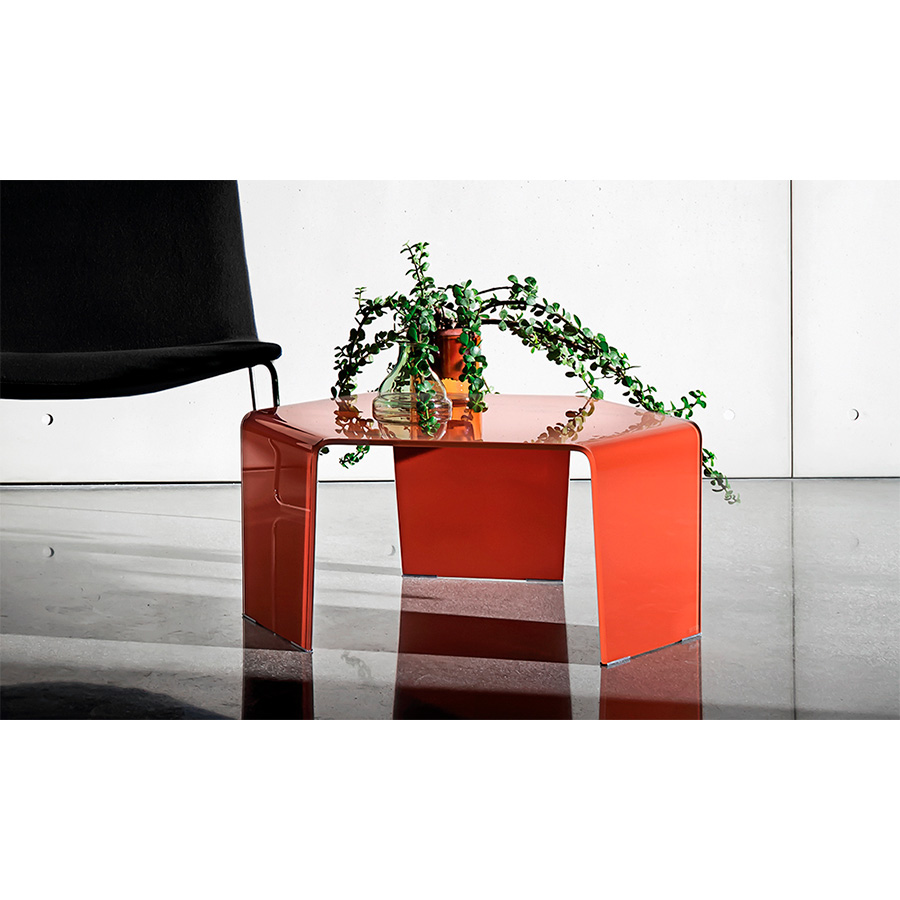 Gianluigi LandoniHexagonal coffee table in extra light bent glass, smoked or lacquered in one or two shades.
