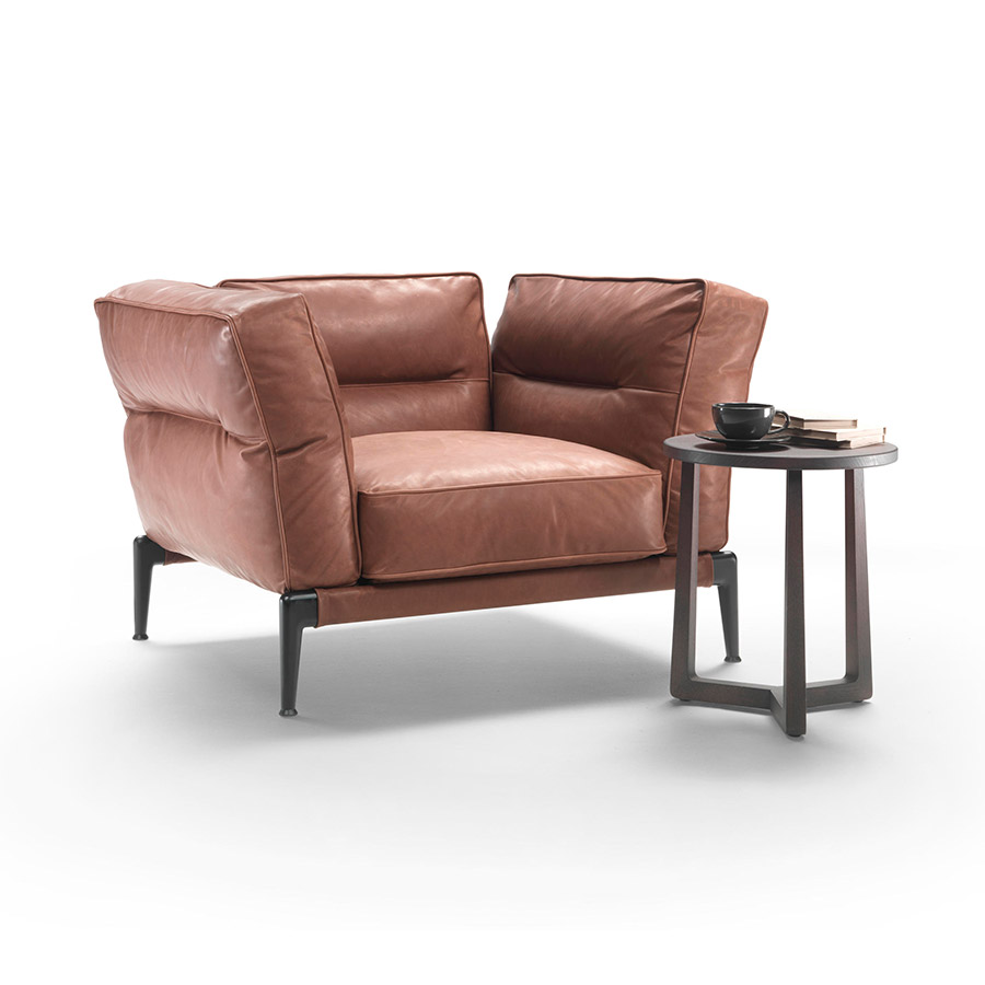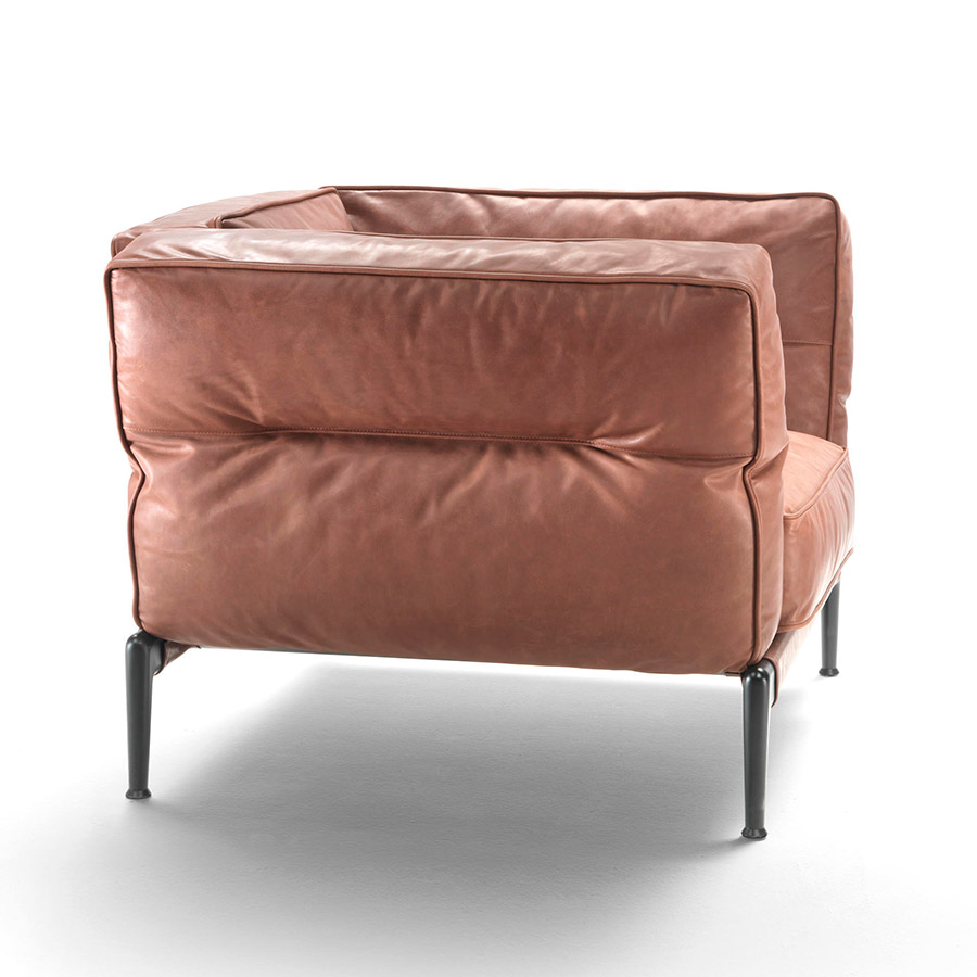 Antonio CitterioThe Adda armchair expresses the same sleek, contemporary aesthetic that characterizes the seating system of the same name. It has a light metallic structure contrasts with the generous padding of the goose-down cushions, characterized by a profile that emphasizes its soft and welcoming shapes. In addition, the cushions are crossed by an original longitudinal seam that produces a slight undulation on the surface of the cover -which can be made of fabric or leather- and that, in addition to highlighting the natural crease that is created in the act of leaning, gives a distinctive feature to the armchair. The armchair rises from the ground on a metal base, upholstered in leather or fabric, while the feet are exposed in die-cast aluminum and reveal a friendly but resolutely contemporary style.