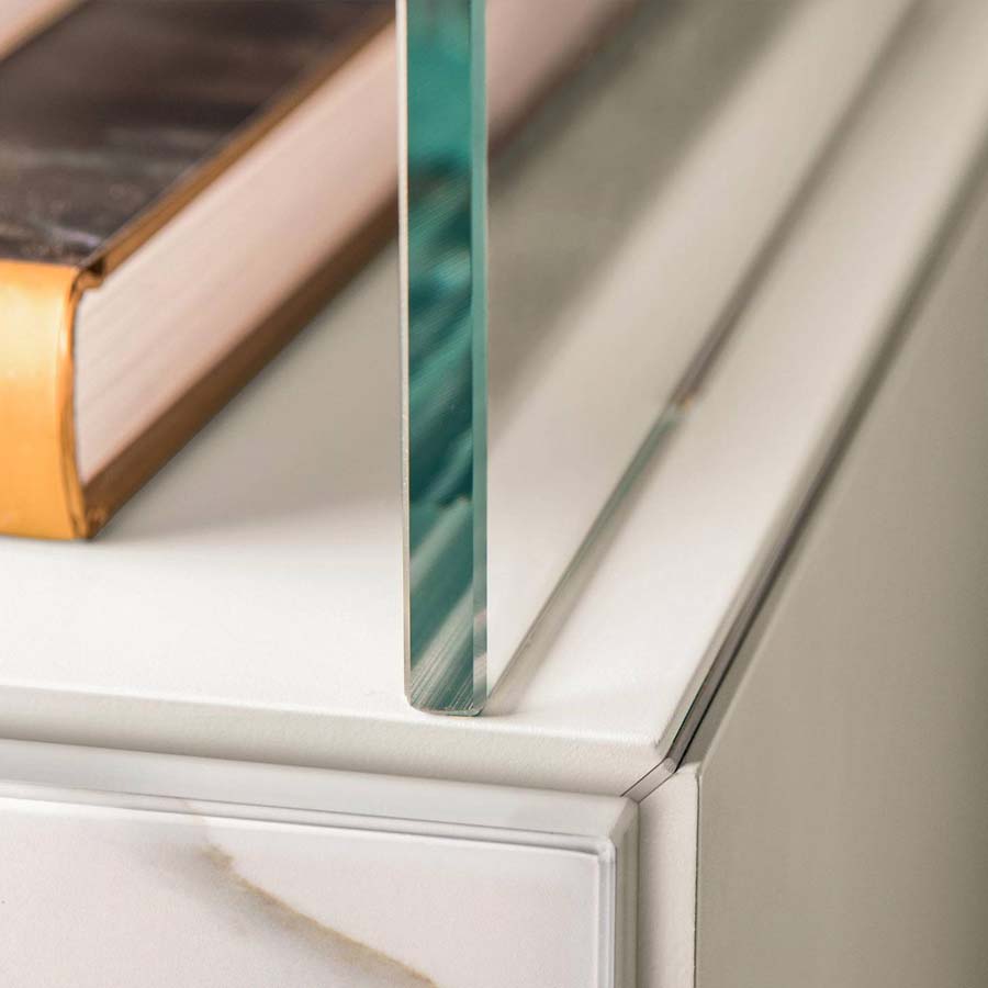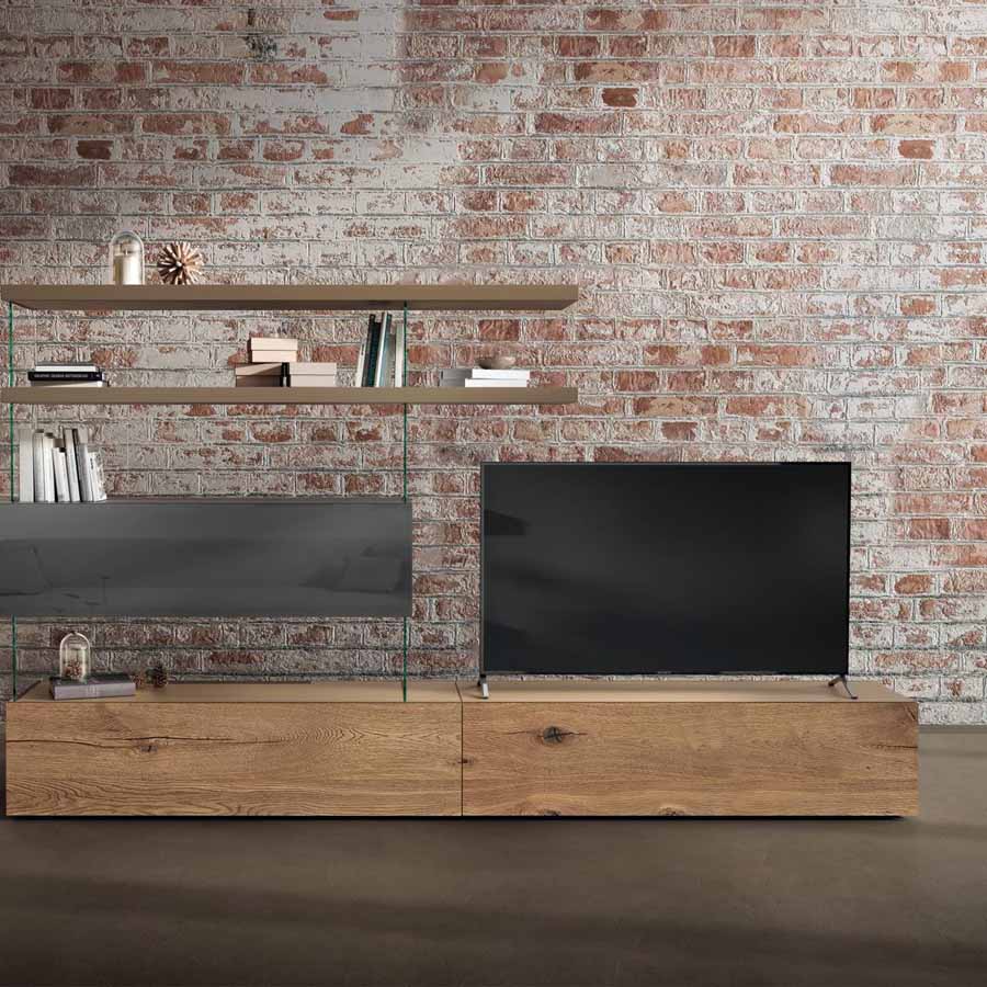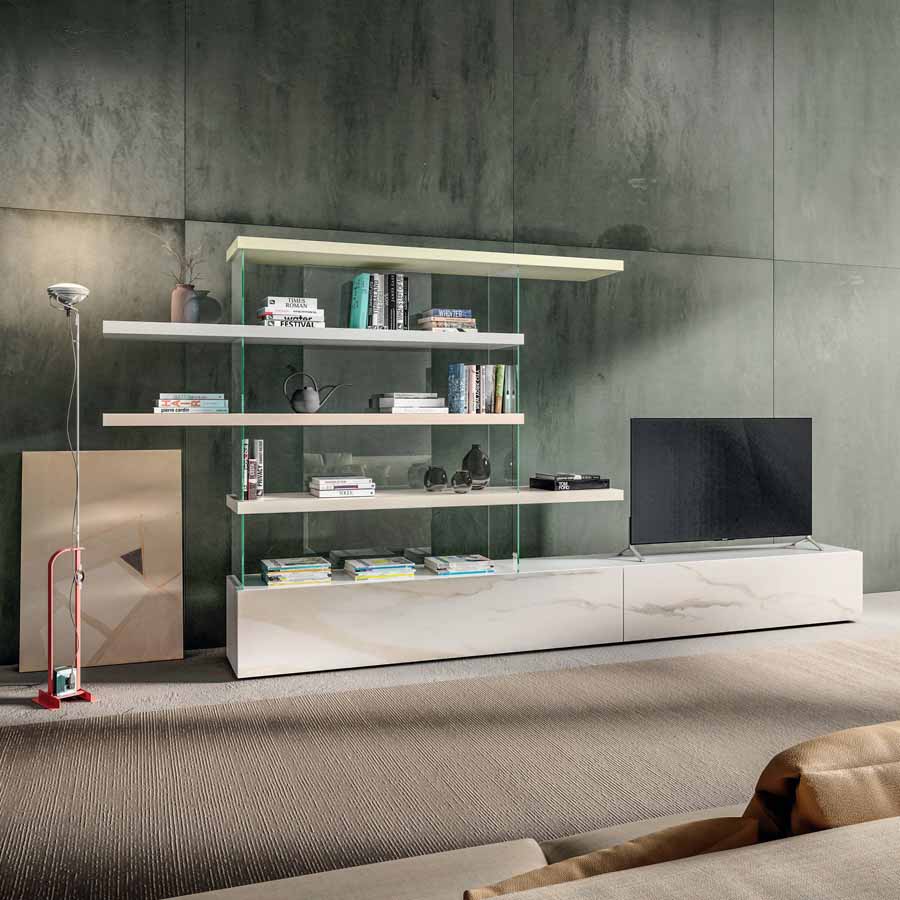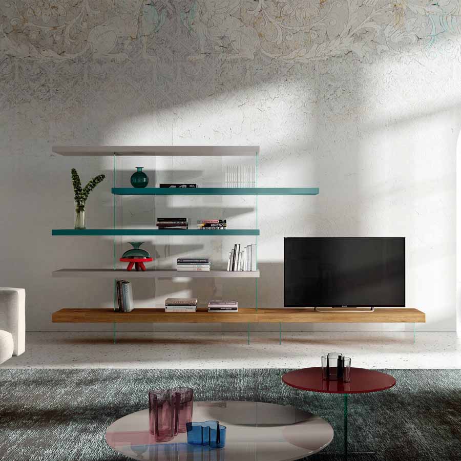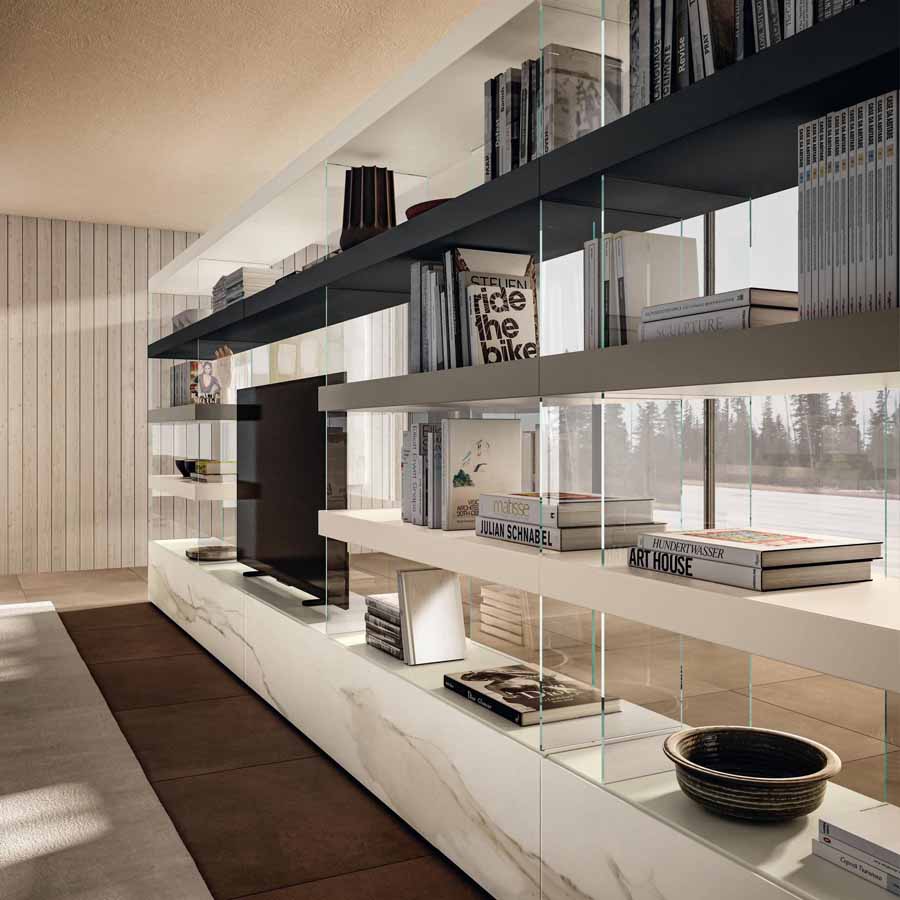 Daniele LagoA game of contrasts, which transmits lightness and at the same time ensures extreme resistance, gives life to the Air equipped wall. The relationship between full and empty is revolutionized thanks to the suspension of shelves and storage units on transparent tempered glass structures. The Air equipped wall, completely free-standing, is an elegant solution that allows furnishing the living room without anchoring links.