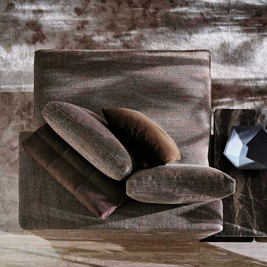 The base is not a mere “one-size-fits-all” element, but rather the frame with rounded profiles that sinuously accompanies the shapes in the Pewter finish to the floor, raising the seat and giving it a floating effect of extreme lightness. A complete and studied collection that surprises with its aesthetic balance, refinement, and versatility. It can be lined with textiles or leathers chosen from among the many proposals in the Molteni&C collection.