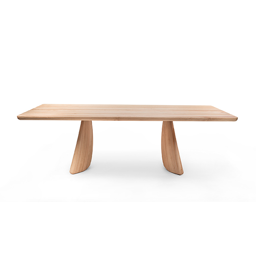 Table made entirely of solid wood, with glued slat top and rounded sides. The shape of the base arises from a game of curves and symmetries that give it lightness.