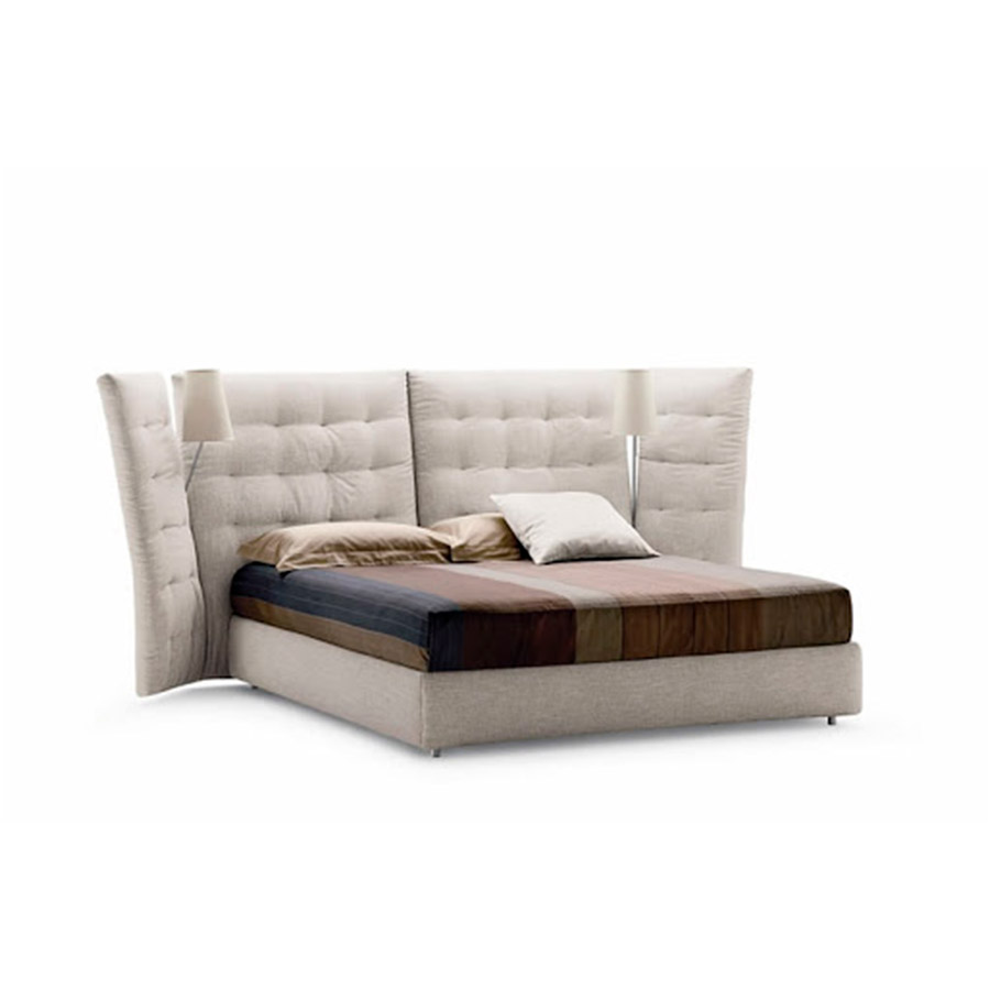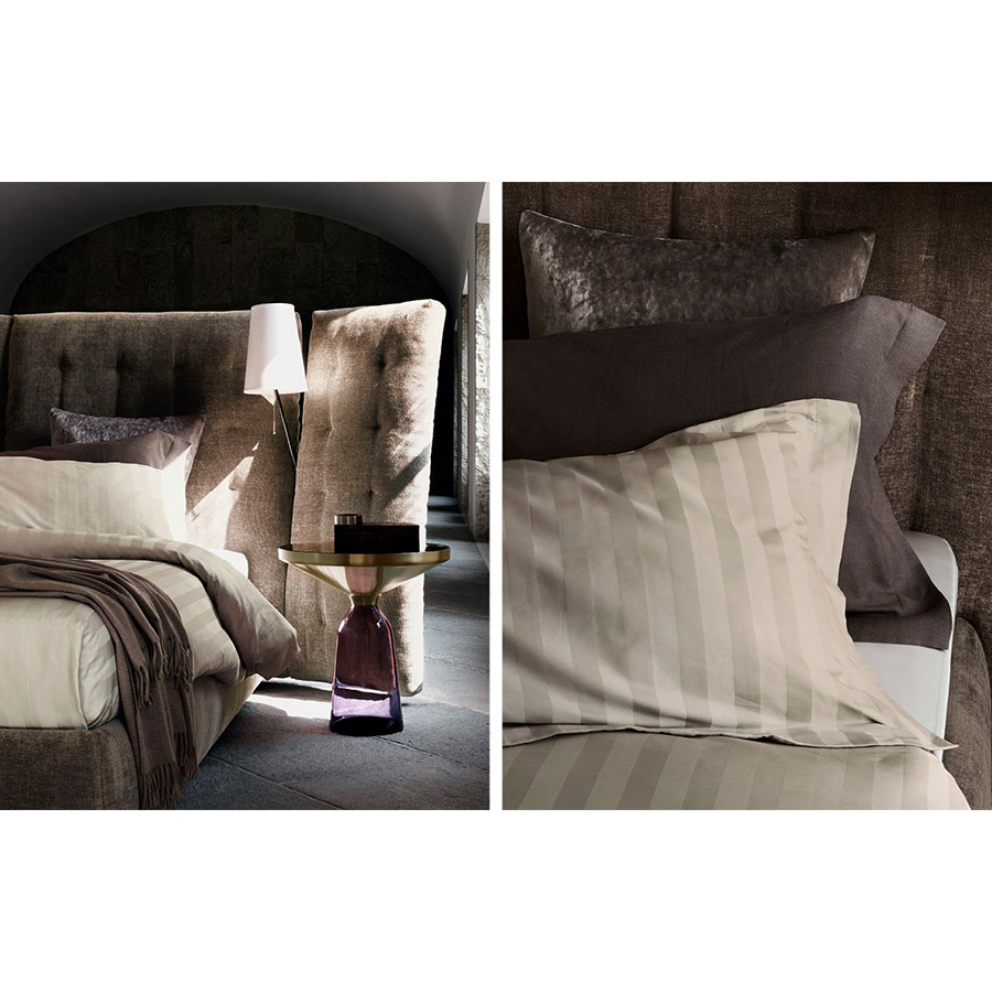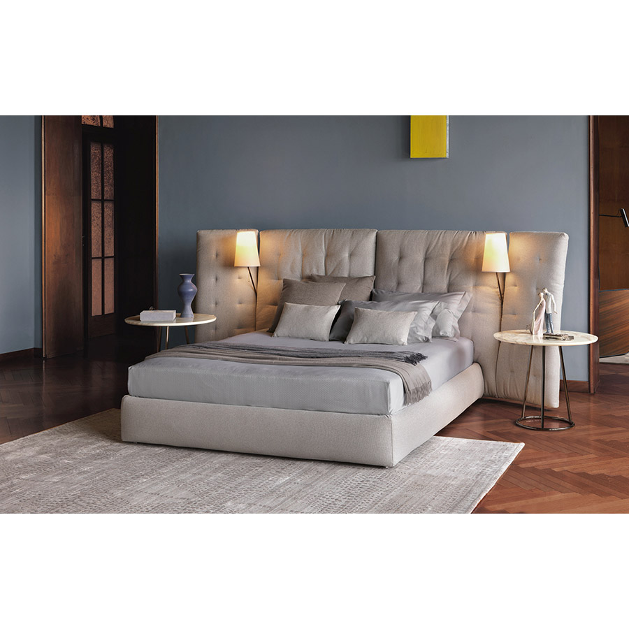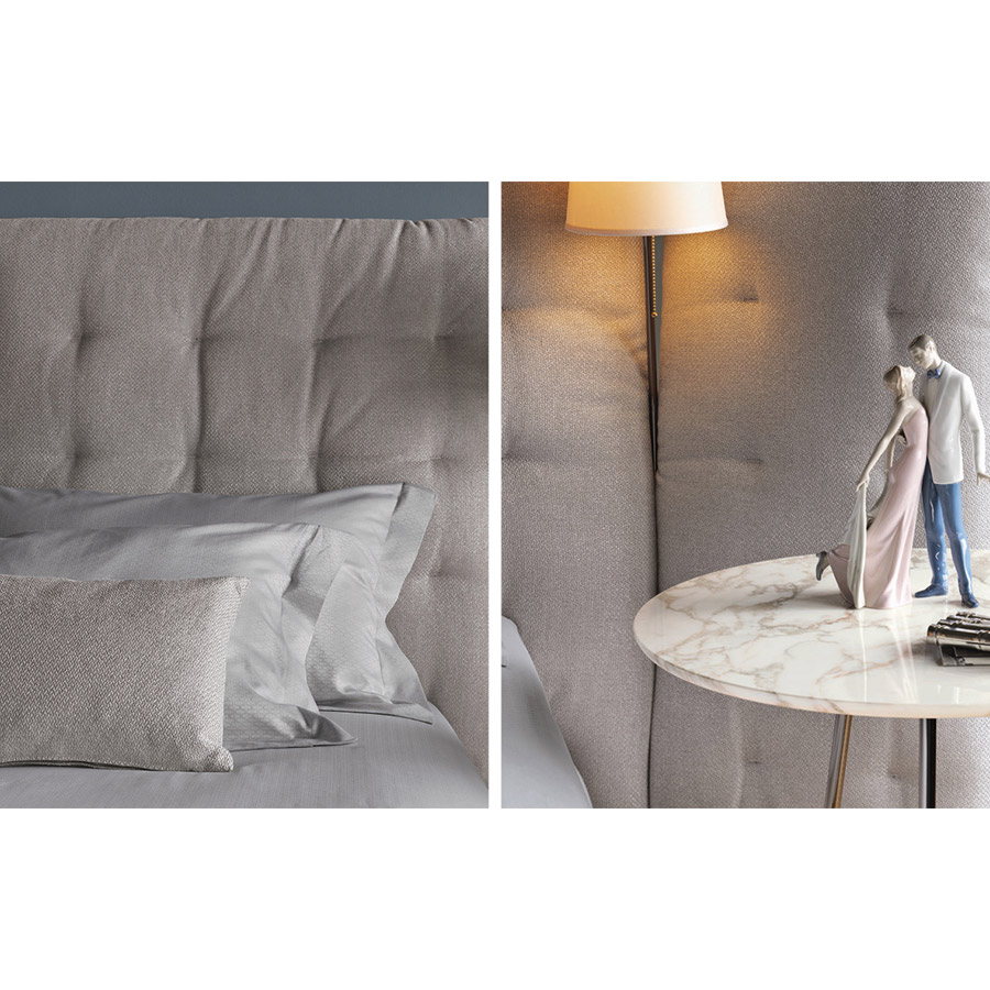 Rodolfo DordoniDouble bed with an important line, proposed in the versions with a simple headboard or enriched by two side panels. Padded headboard in a capitonné version, with completely removable covers in fabric or leather. Available with Leonardo spring base, fixed base h 25 cm, container base or base with electric movement. At the intersection between the headboard and the Angle side panels, it can be equipped with two Angle lamps with a bright chrome, gold or bronze tubular structure.