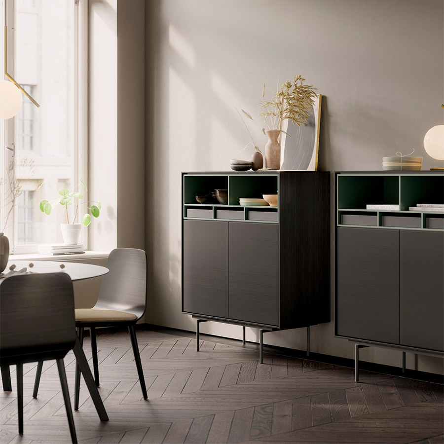 The Aura collection has been conceived mainly for sideboards and furniture for living rooms and dining rooms. Its design is inspired by the past and under the influence of the design culture of the Nordic countries, which know how to combine tradition and naturalness with large doses of modernity. The result: a collection full of memories that gives off a very modern aura. The metal and wood legs designed especially for the collection reinforce that retro and timeless look. The finish is very important: walnut and oak wood with a hyper-natural finish and a lacquered look which combine perfectly well with the wood.