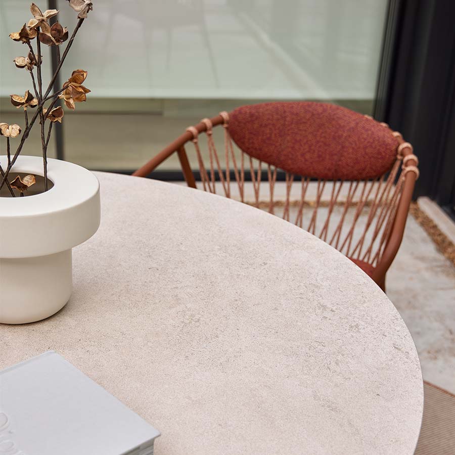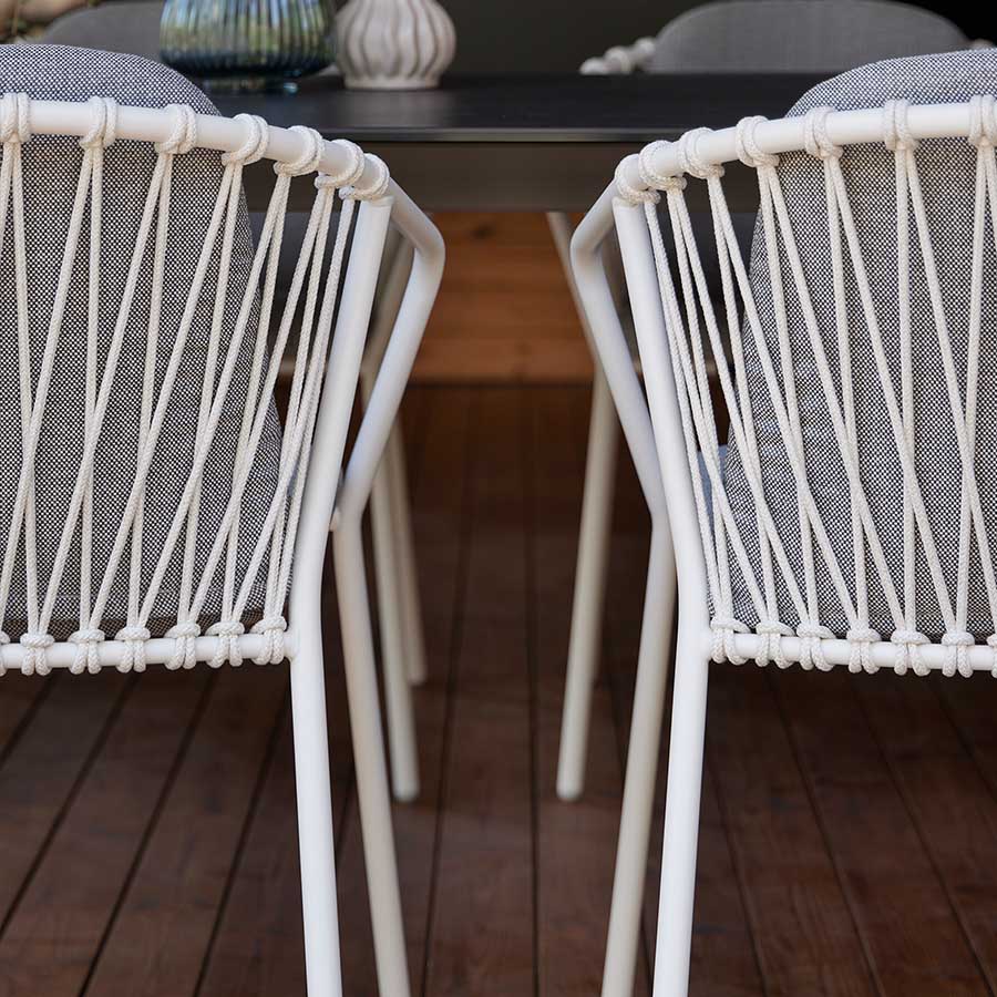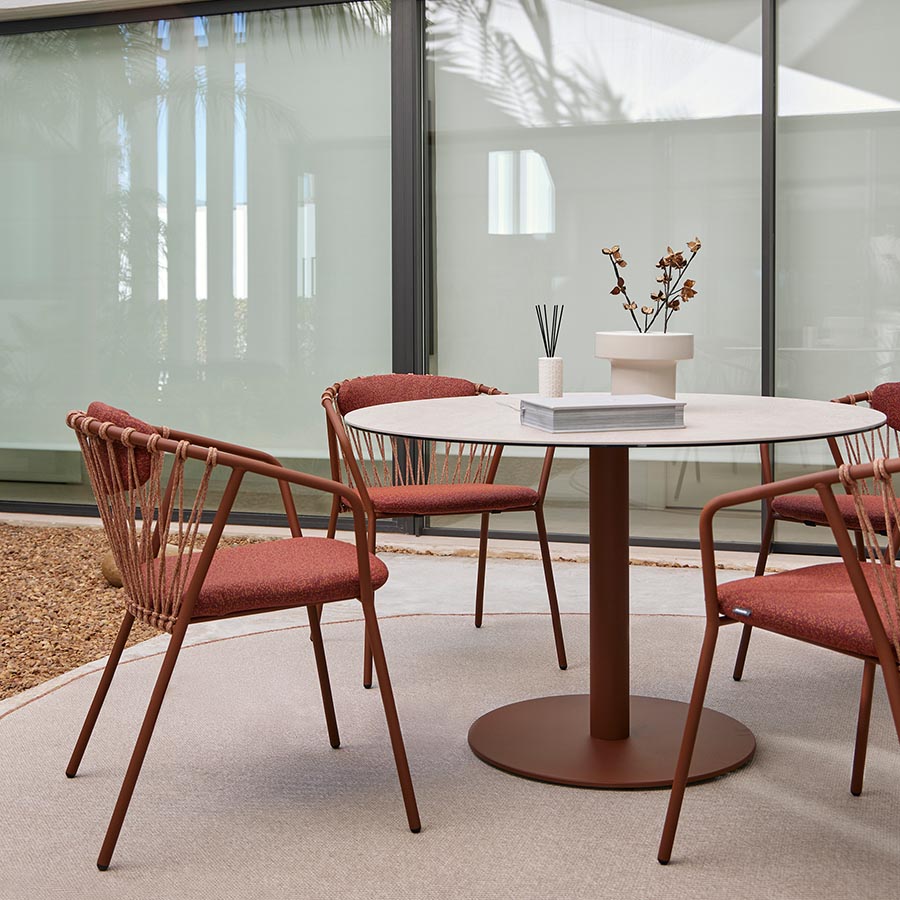 A chair with a fully stainless steel structure. Its seat, available in one or two pieces, is removable and has a cover, with an interior made of hydrophobic polyurethane foam (Dry Feel) and polyester fiber. The backrest is made of polypropylene rope, available in various colors. Additionally, it can be stacked up to 4 chairs high.