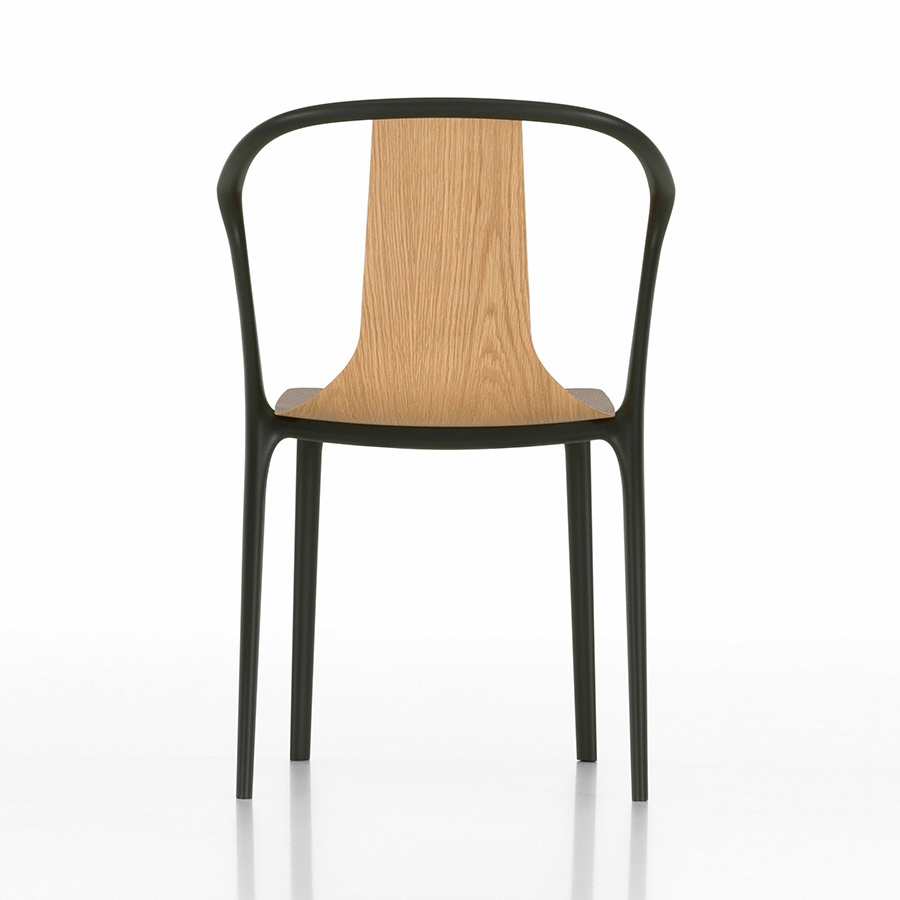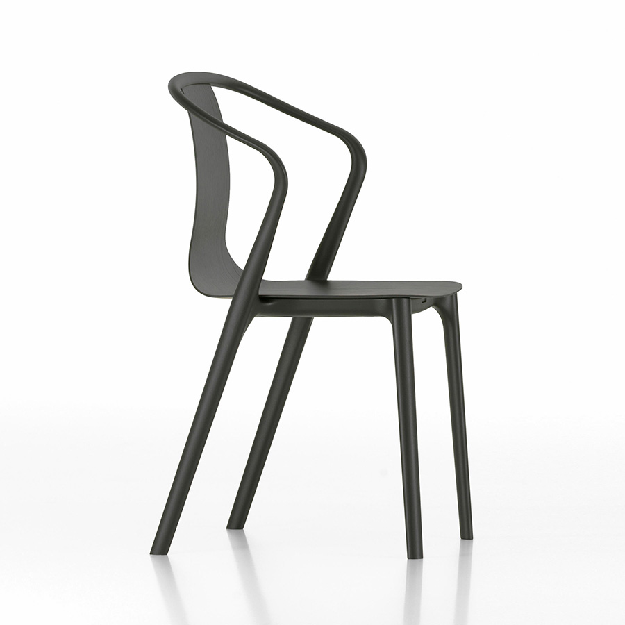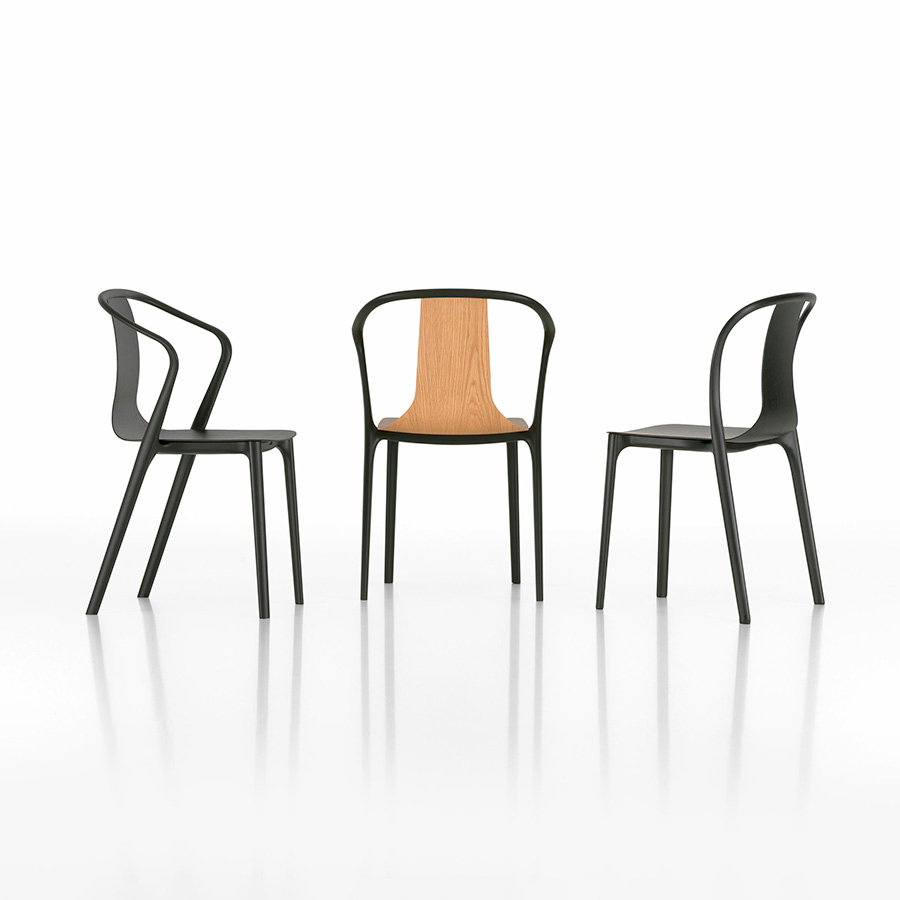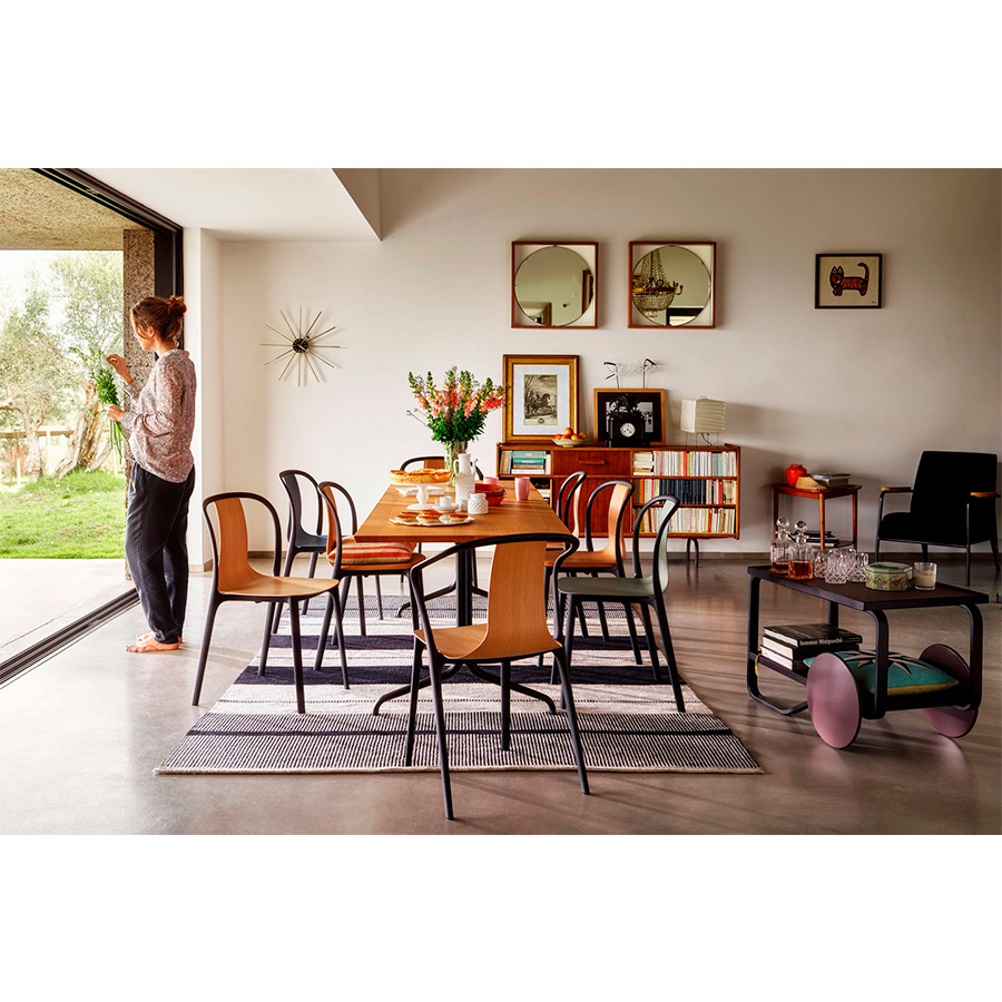 The plastic Belleville Chair consists of a structural frame and a seat shell. The elegant structural frame traces the calligraphic lines of the chair's legs and back and is available with or without forward sloping armrests. The slim seat shell tapers up from the seat to become the backrest. In addition to the plastic version in different colors, the shell is also offered in laminated plywood or upholstered in leather or fabric. Belleville Chair Plastic is also suitable for use outdoors.