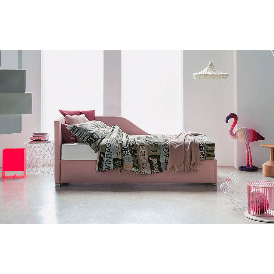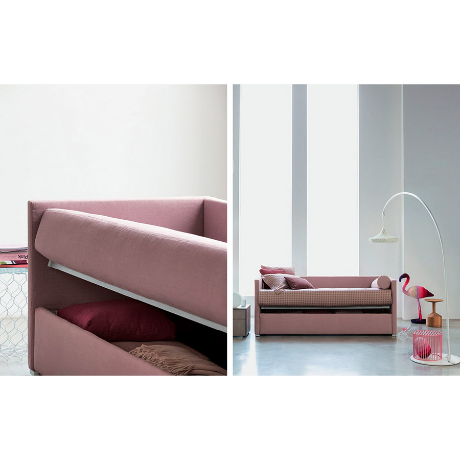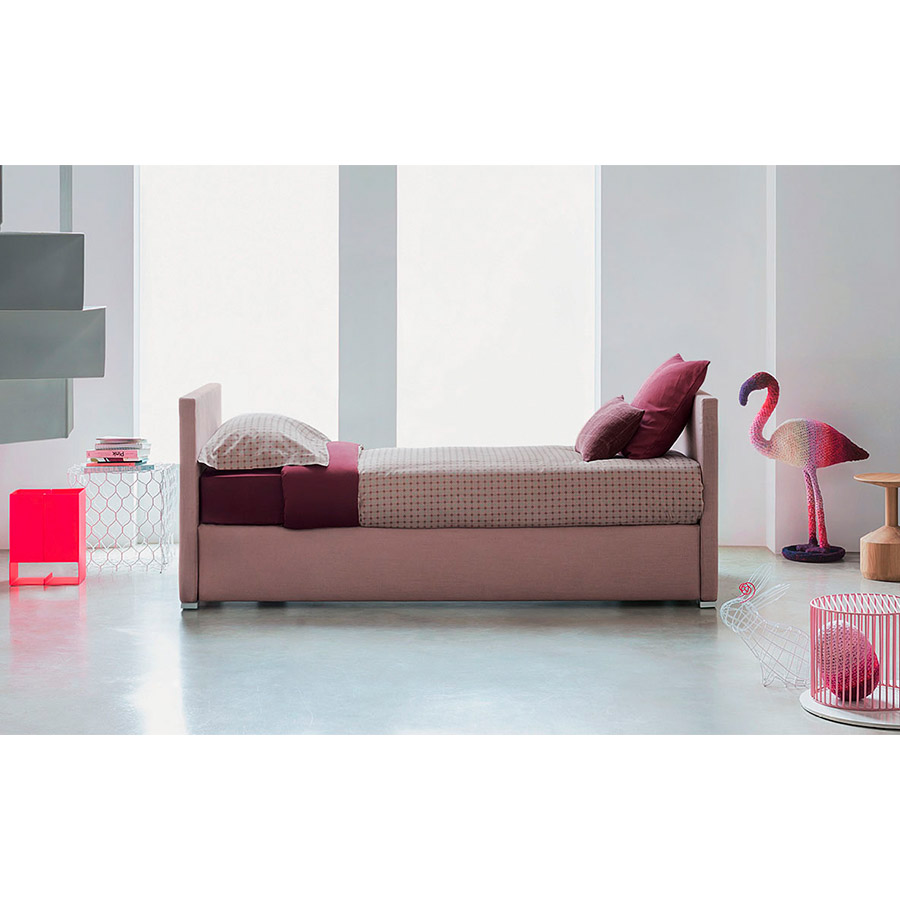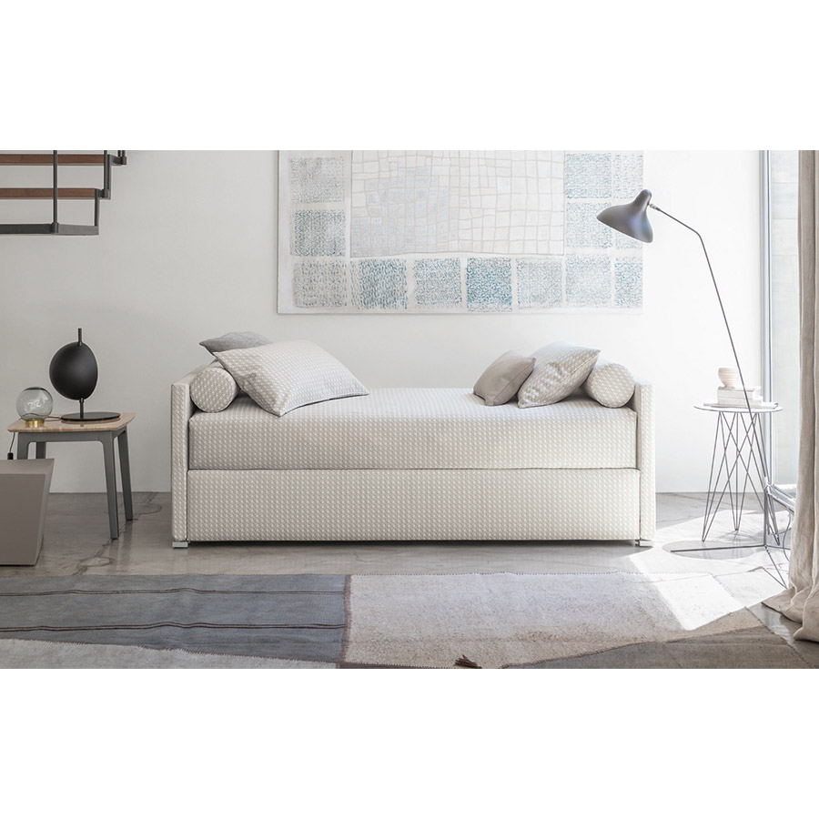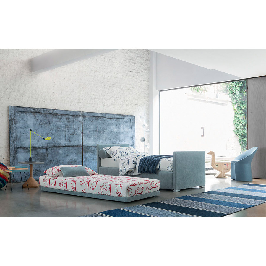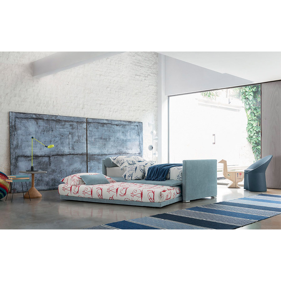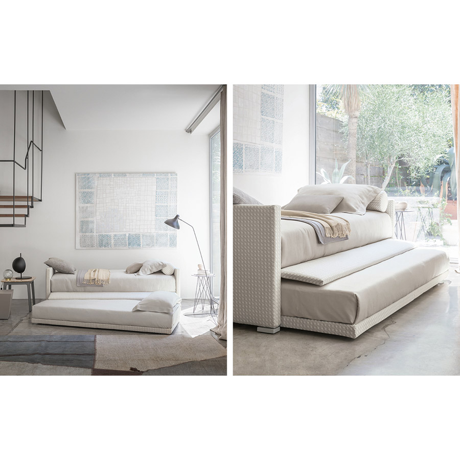 Pinuccio BorgonovoBiss is a single bed in two versions: base with a container and base with a side opening that allows a second bed to be accommodated. In the first version, the bed has a container base with a side opening (opening to the right or left). In the second, the base has one of the two sides with a cover that accommodates a second bed (without a headboard). This second bed has wheels that facilitate its removal and is available in variants that can be raised from the ground thanks to a piston mechanism or at ground level (without mechanism). Biss has a bed base with fixed slats with hardness regulation and coverings in fabric, leather, or Ecopelle with removable covers thanks to Velcro. They can be completed with high, low or asymmetric backrests (left and right sides).