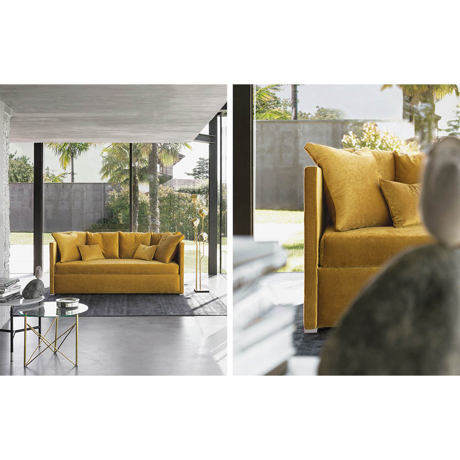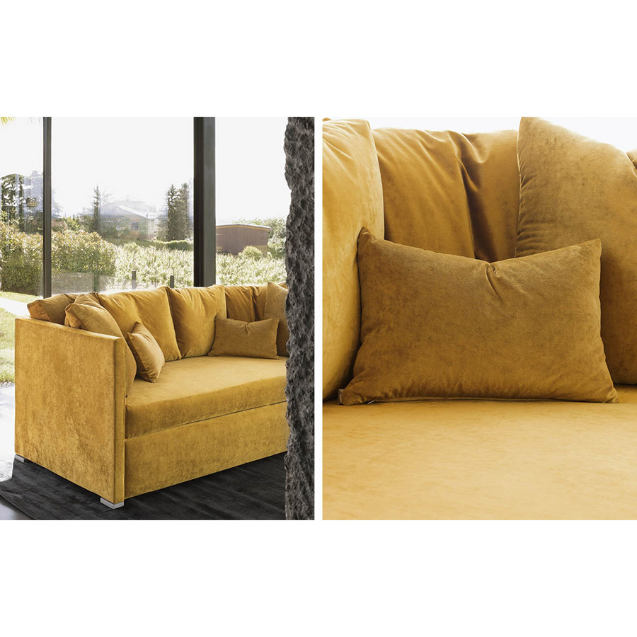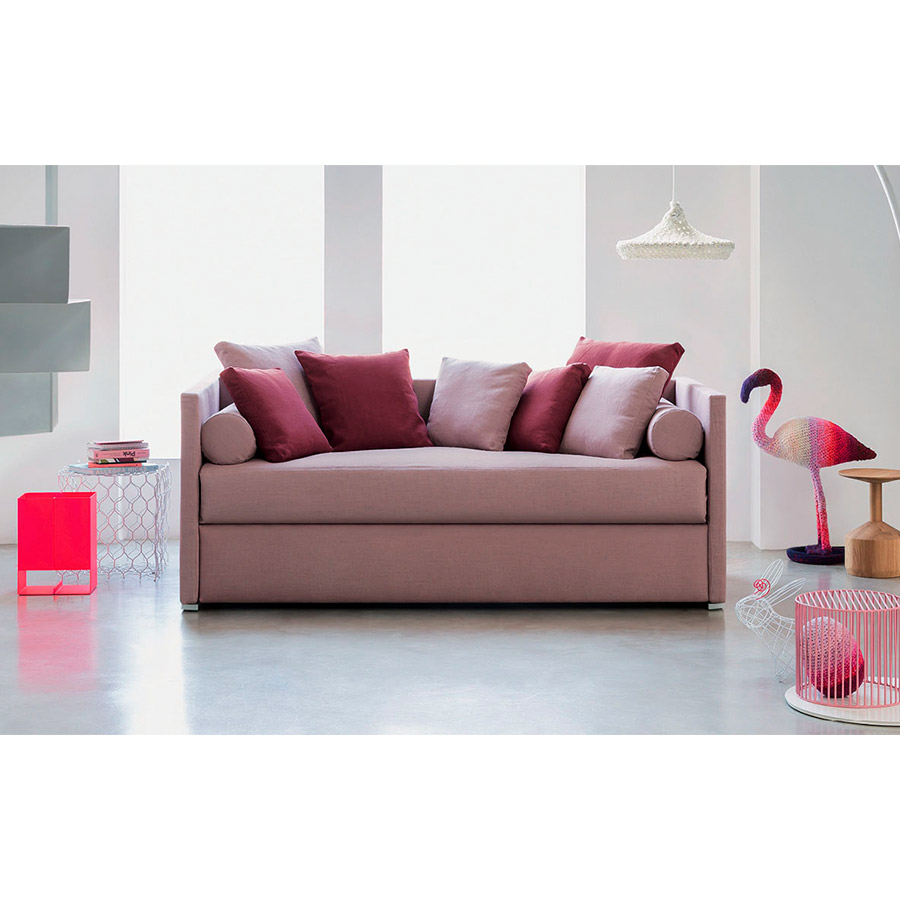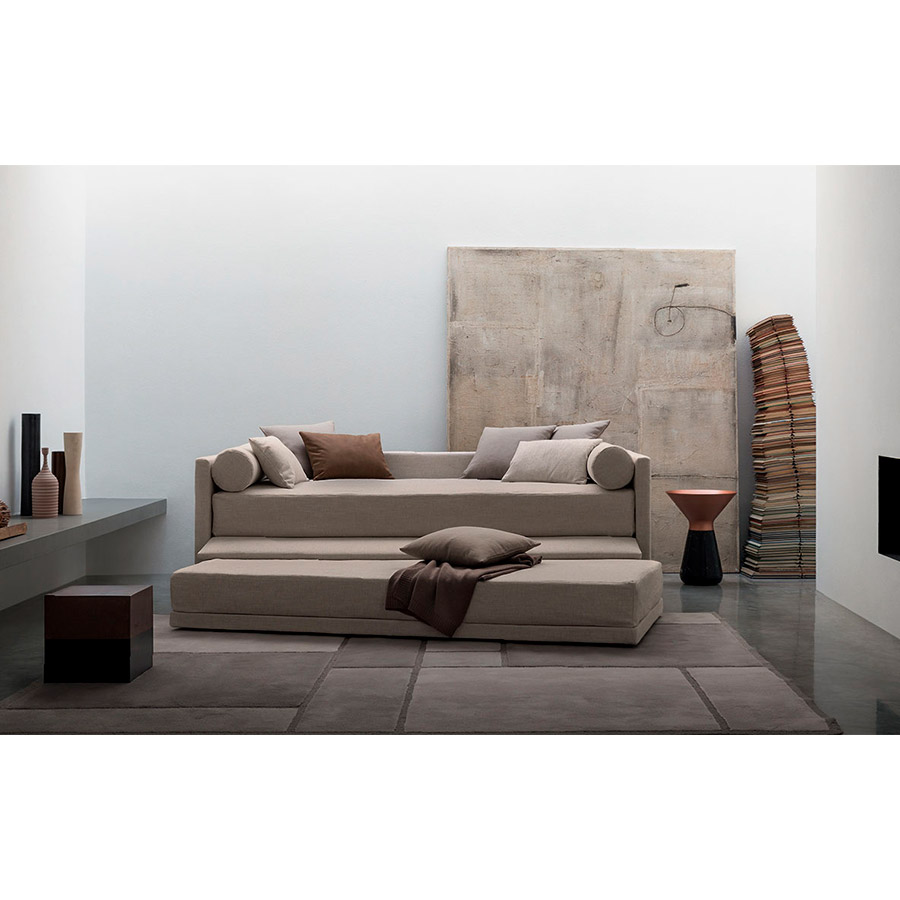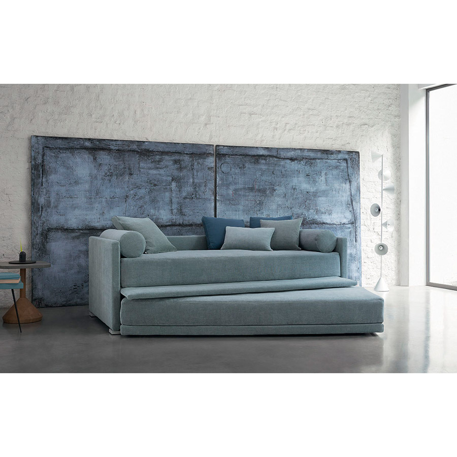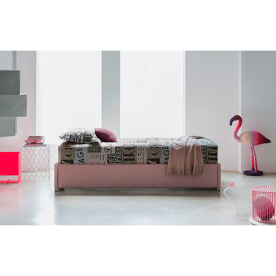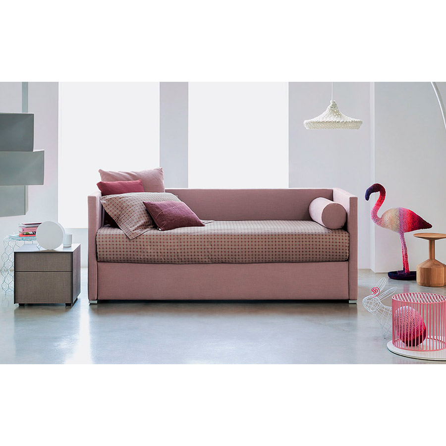 Pinuccio BorgonovoBiss is a single bed in two versions: base with a container and base with a side opening that allows a second bed to be accommodated. In the first version, the bed has a container base with a side opening (opening to the right or left). In the second, the base has one of the two sides with a cover that accommodates a second bed (without a headboard). This second bed has wheels that facilitate its removal and is available in variants that can be raised from the ground thanks to a piston mechanism or at ground level (without mechanism). Biss has a bed base with fixed slats with hardness regulation and coverings in fabric, leather, or Ecopelle with removable covers thanks to Velcro. They can be completed with high, low or asymmetric backrests (left and right sides).
