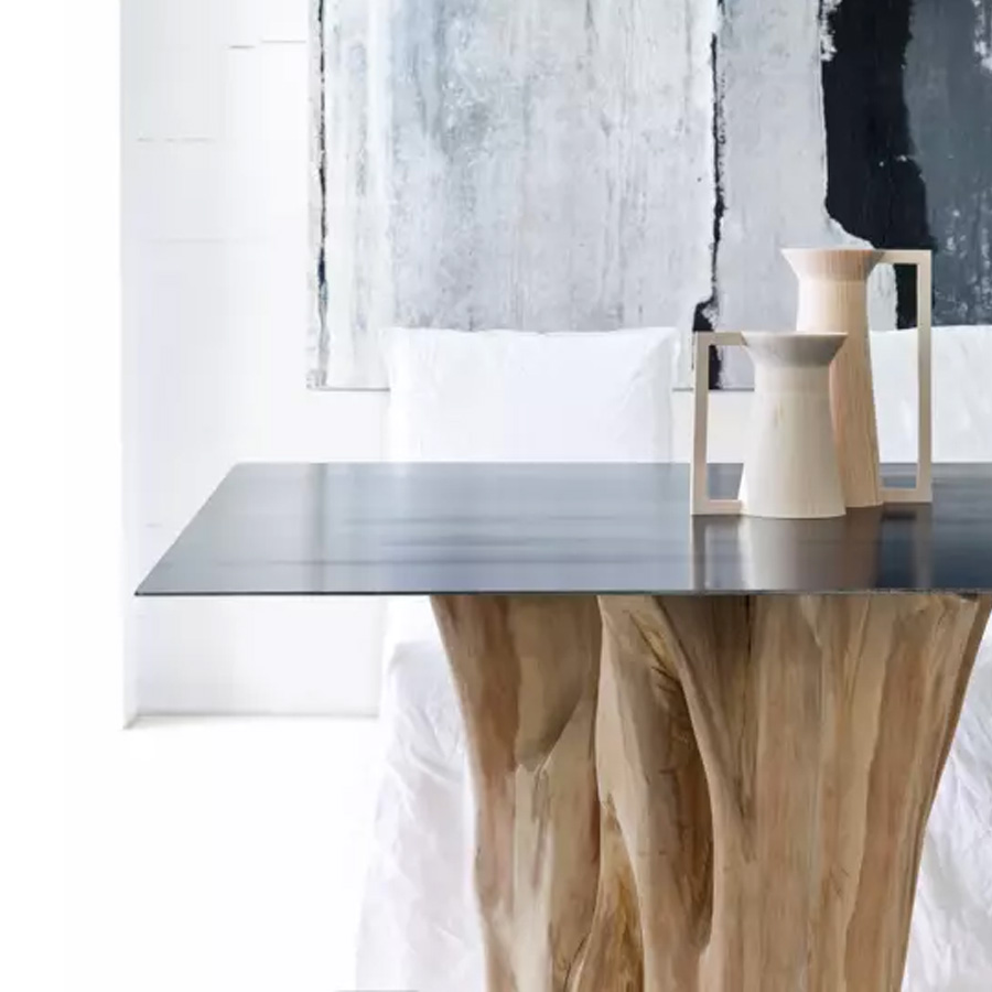 Paola NavoneA strong and distinctive sign characterizes the Brick 32/33/34/36 family of tables. The Nordic references are evident in the important base in debarked natural hornbeam trunk sections, which is placed in visual contrast with the fine waxed iron sheet tabletop. Available in various sizes and with rectangular, square, and round tops, it combines natural materials with industrial touches.