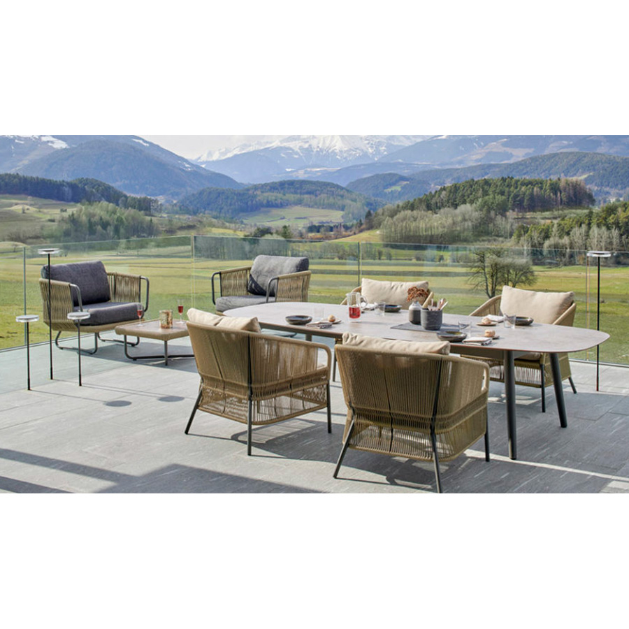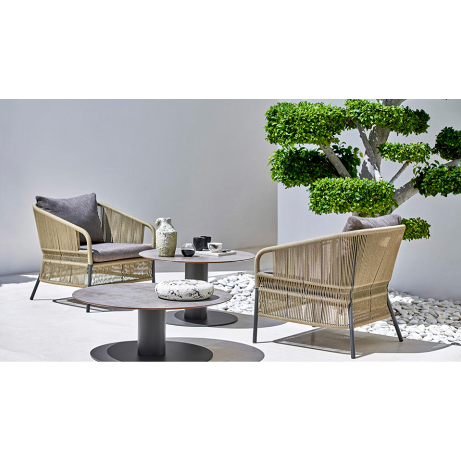 Anki GneibThe lounge chair from the CRICKET collection is identified by its hand-woven rope backrest. Its twisting is a precious handcrafted element, a refined detail that emphasizes shape and design.