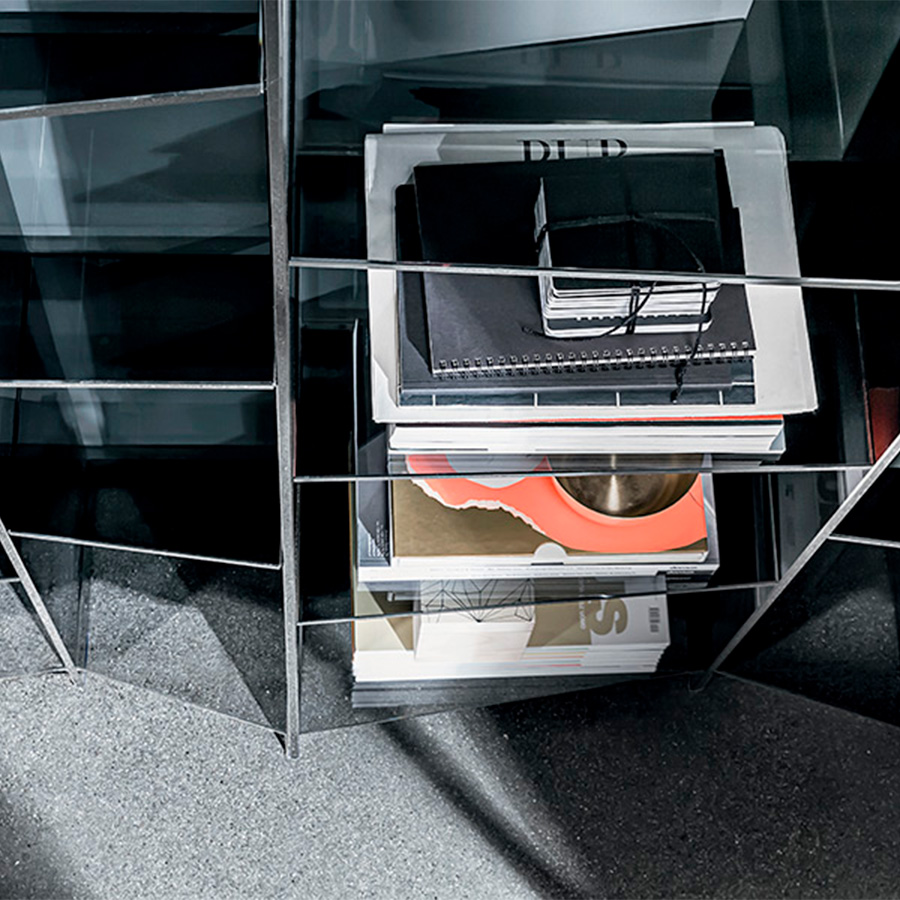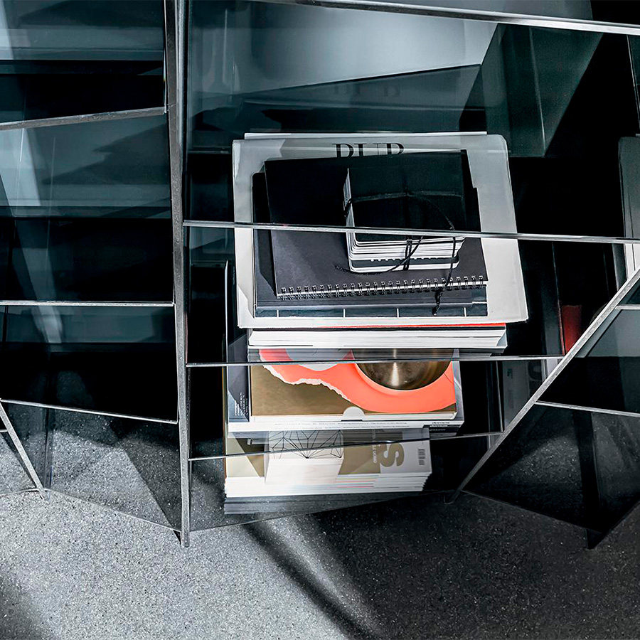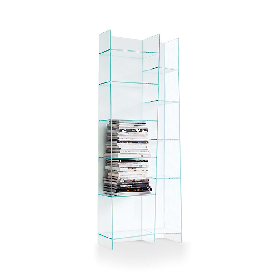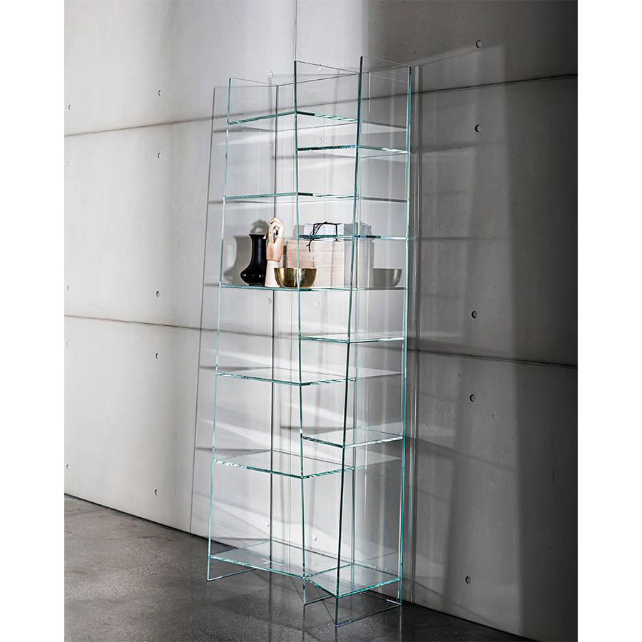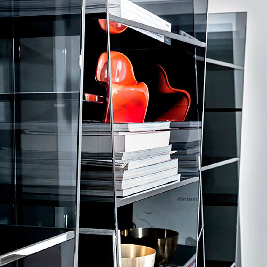 Delphi is a modular glass shelf that creates a curved "wave" effect through its trapezoidal shelves of different sizes. The smoked glass version has a refined charm, while the extra-light finish looks exceptionally light and spreads brilliance in the room.