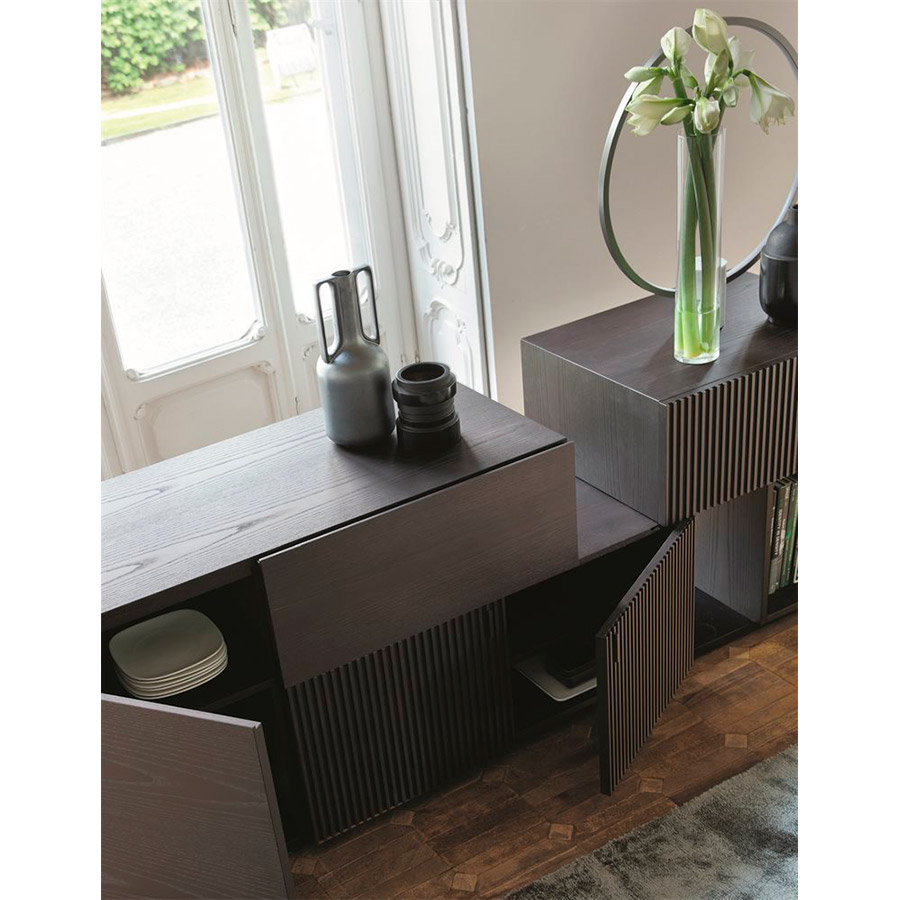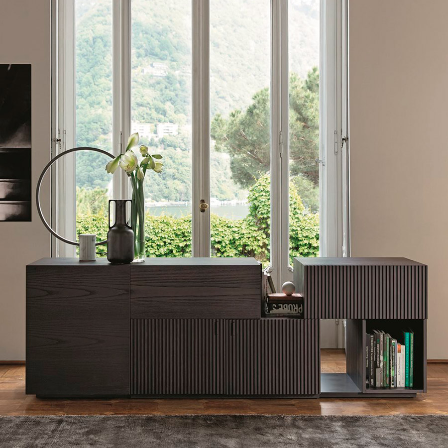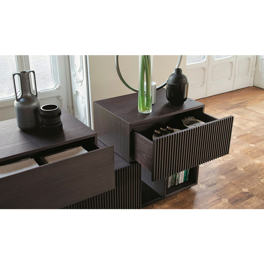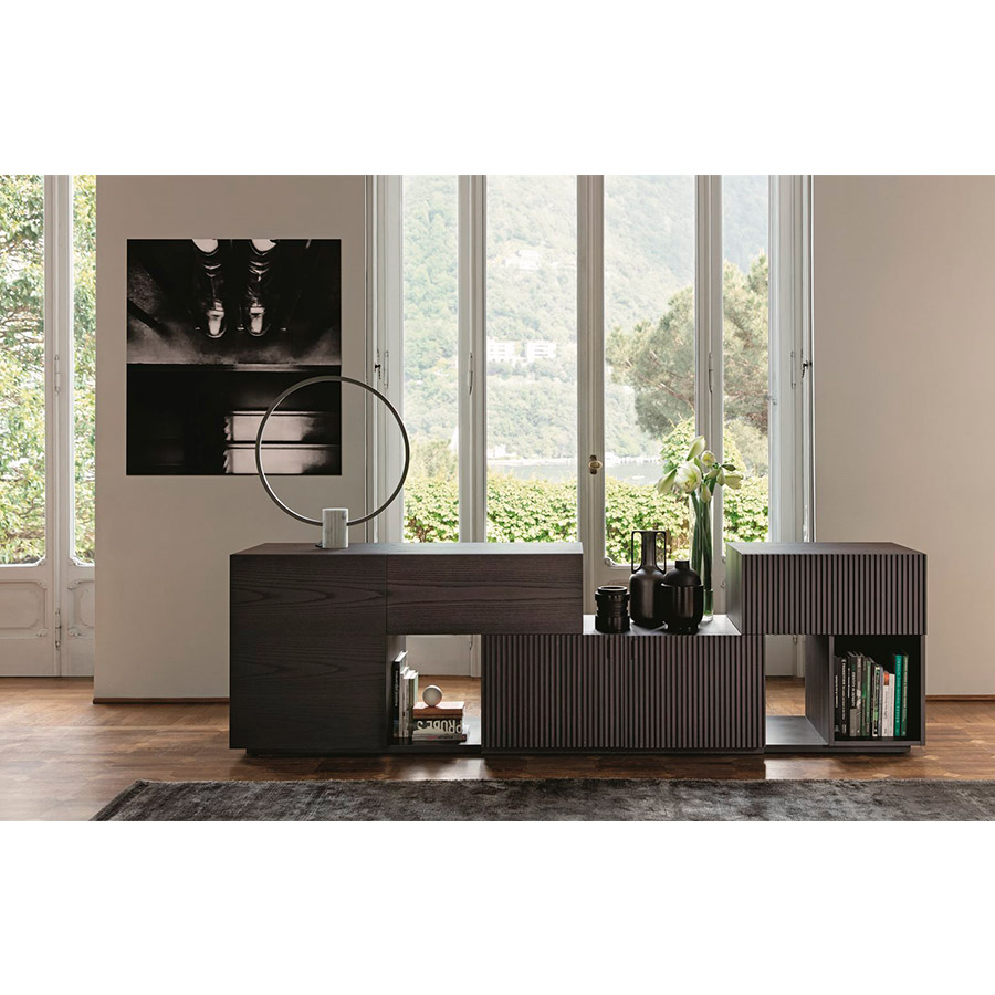 M. Marconato T. ZappaDrift is an extendable width sideboard with an ash structure and black lacquered base. Provided with two containers with doors, two drawers, and an open container. Closed, Drift dimensions are 200x55x75, open 260x55x75