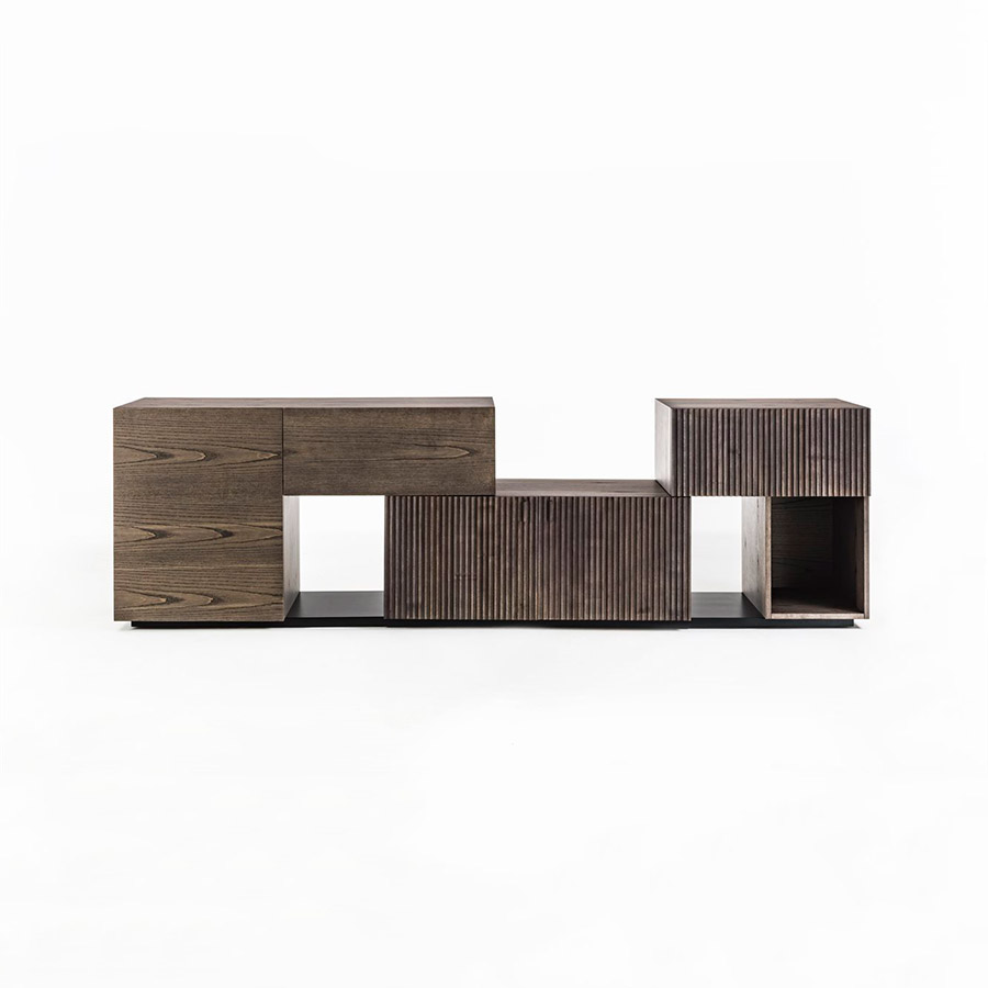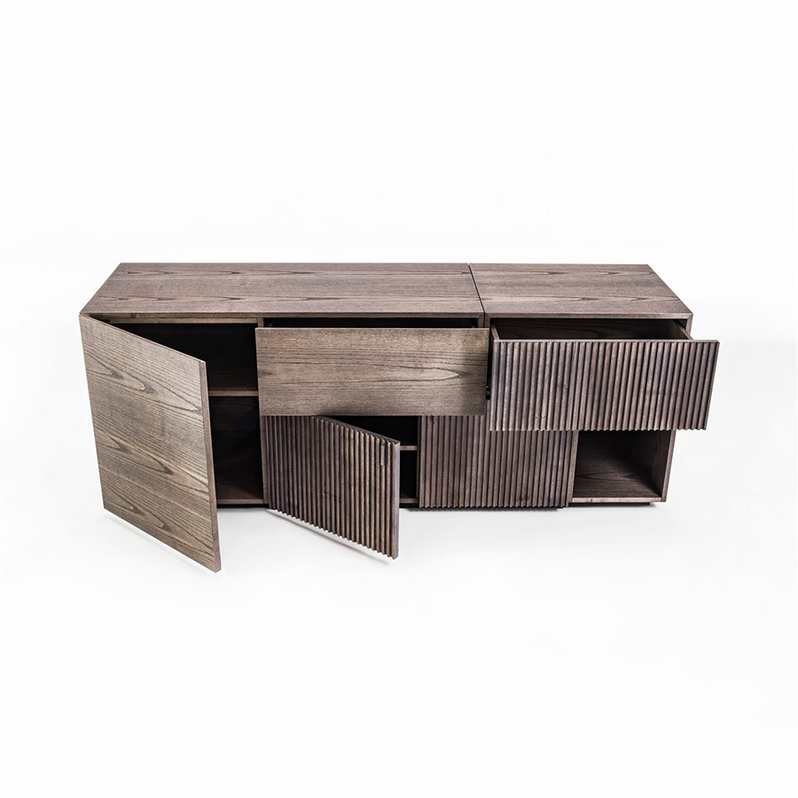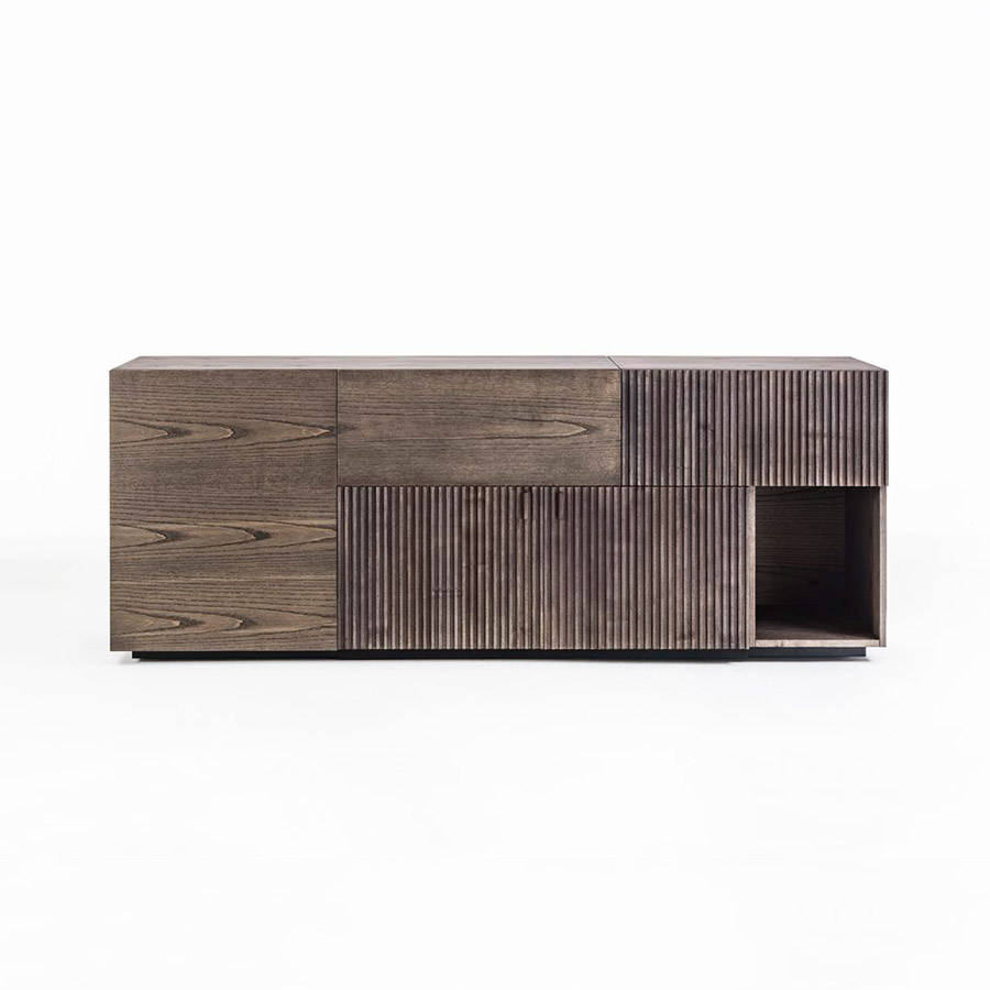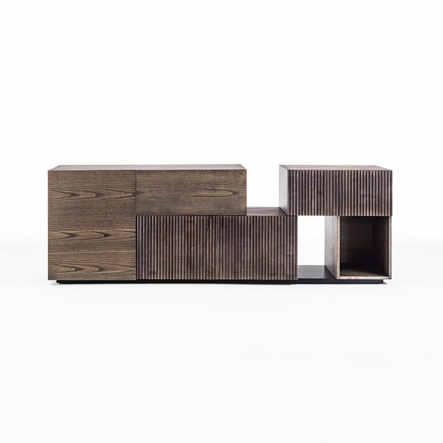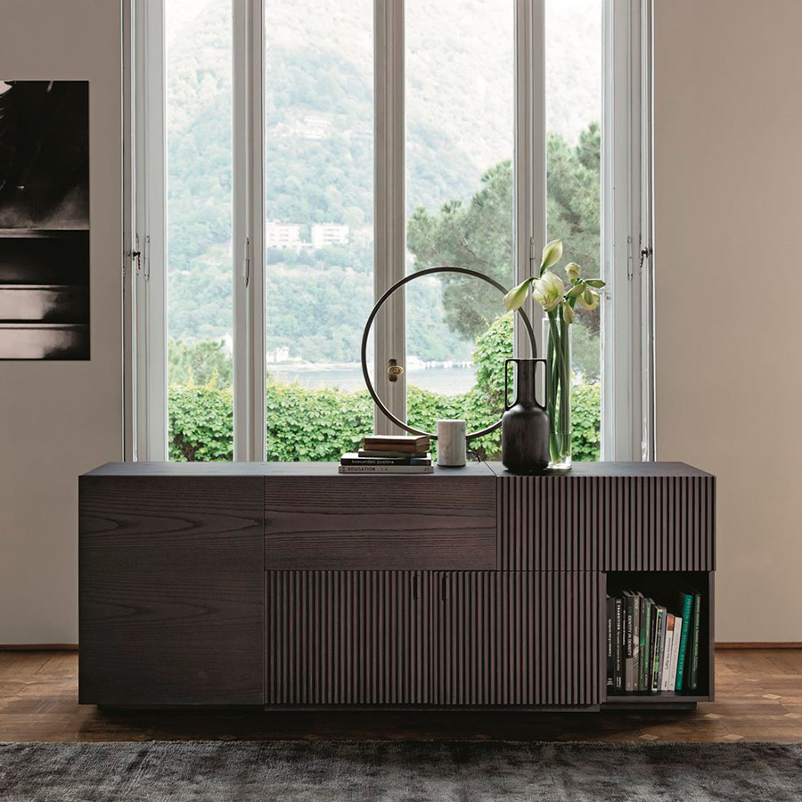 M. Marconato T. ZappaDrift is an extendable width sideboard with an ash structure and black lacquered base. Provided with two containers with doors, two drawers, and an open container. Closed, Drift dimensions are 200x55x75, open 260x55x75