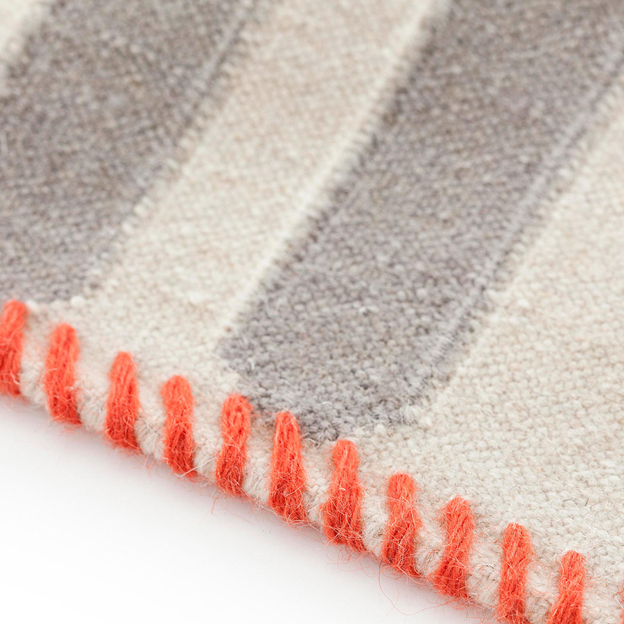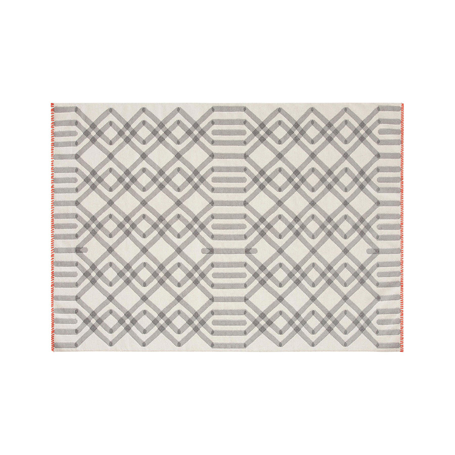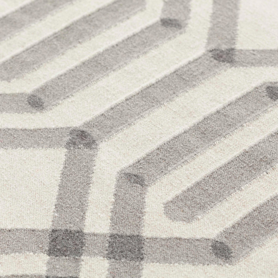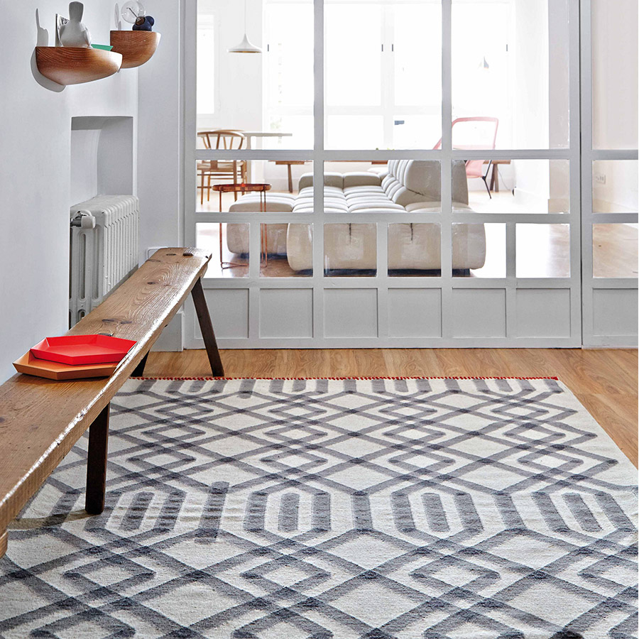 This is the Duna rug model from our kilim collection, a piece with a version for the foot of the bed and another for the corridor. Its hypnotic and intricate design of rhombuses that intertwine to infinity is created from a simple combination of a series of straight and diagonal lines. A schematic geometric drawing pattern devised by the Odosdesign studio. The Kilim is an artisan method of making rugs in which only threads are used, firmly interweaving the weft on a manual loom without knotting. Due to this process, the result is a light fabric with a texture without hair, similar to upholstery. In addition, it is a technique that offers excellent flexibility in the design, a peculiarity that at GAN we explore in depth to conceive rugs with high-impact drawings and details.