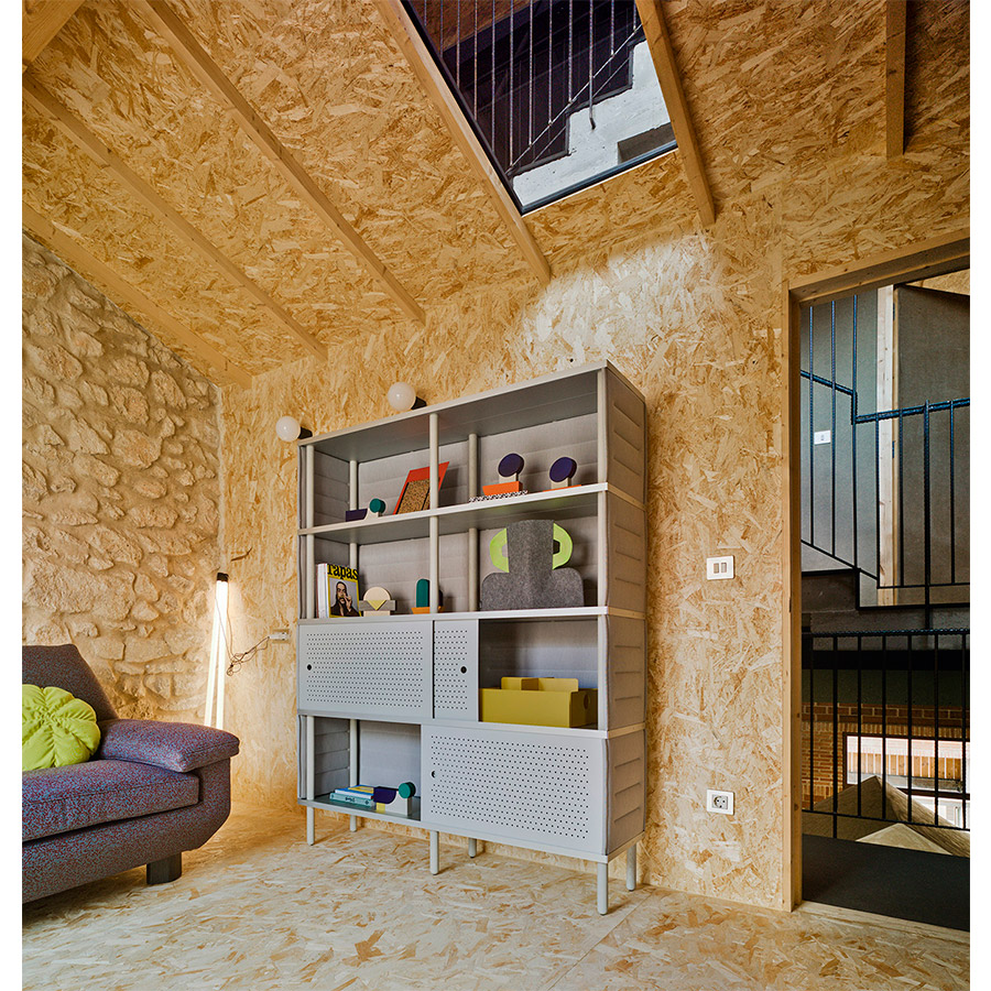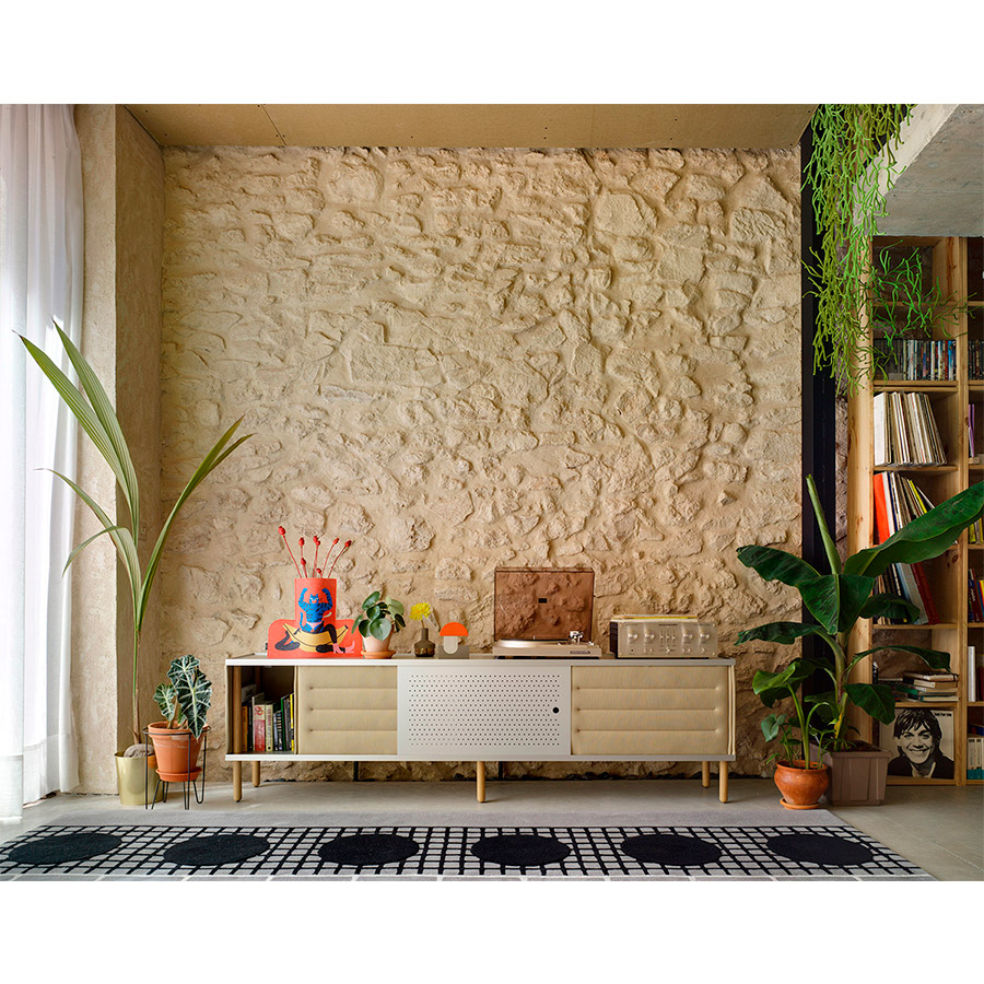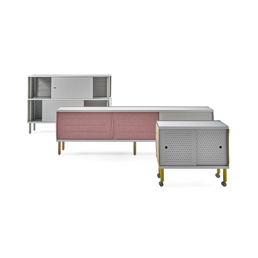 Estante is a modular piece of furniture with acoustic properties. The metal shelves are the skeleton, the central piece around which everything revolves. To them are added the oak legs and the pilasters that support them. But without a doubt, the maximum distinction is given by the textile pieces that adorn them. The upholstered modules and the doors cover the shelves and incorporate a sound-absorbing design, thus transcending the decorative function. Wooden doors favor the contrast of materials. In addition, the metal doors have been perforated to generate an attractive texture and not hinder acoustic absorption.