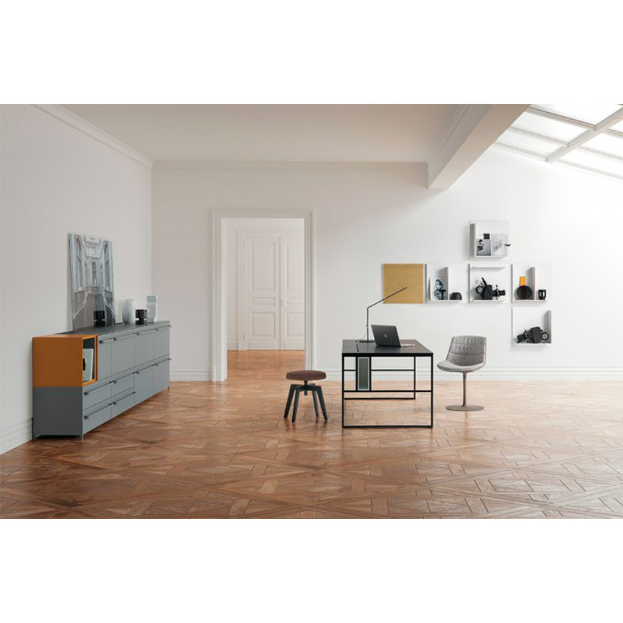 Jean-Marie MassaudPouf designed for the home, office, and community areas, completing the Flow collection. Available with 4-legged oak base and VN 4-legged oak base (natural, bleached, or brown finish). Seat H48cm. With plywood structure covered with non-deformable polyurethane and polyester wadding, completely removable.