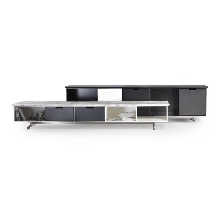 Antonio CitterioThe large Fly family, in addition to numerous dining tables and coffee tables, also includes two low cabinets whose ideal placement is in the living room. With a light appearance, the Fly containers are characterized by a rigorous metal structure enameled with epoxy powder inside and out in a wide range of sophisticated shades. The feet, also in metal, have the same design as those used for the tables, while the shelves are offered in different varieties of marble. Fly containers can be completed with Box leather baskets in different colors.