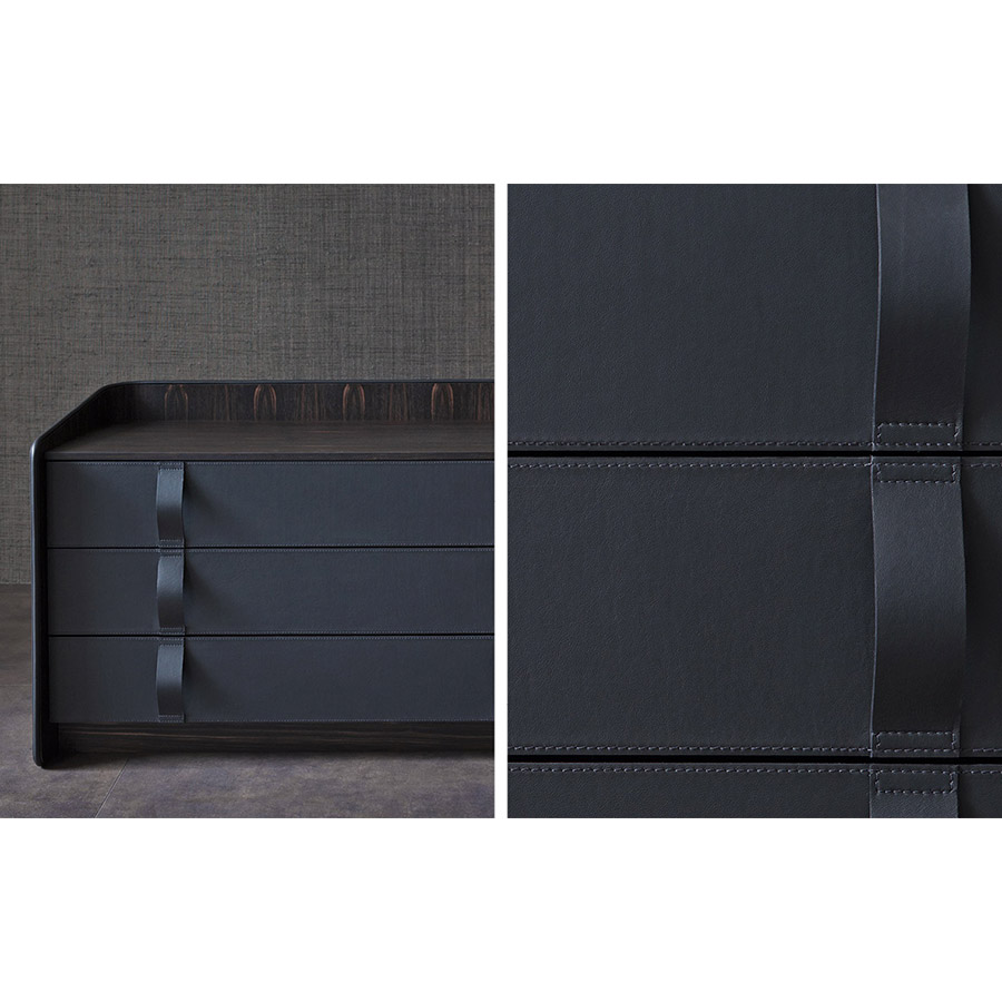 Carlo ColomboThe comfort of the three drawers and the bedside tables, the elegance of the lines, the importance of the materials, and the care in the workmanship fully express the values of authentic Made in Italy. The curved multilayer structure is externally covered in leather and internally in ebony with a matte finish. The perimeter edge of the skin (tone-on-tone or in contrast). Upper plane and the lower plane of ebony. Leather fronts and handles.