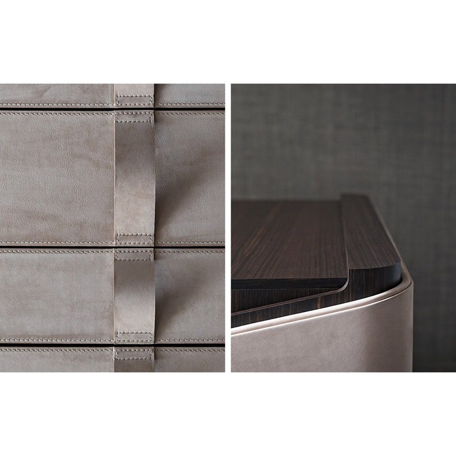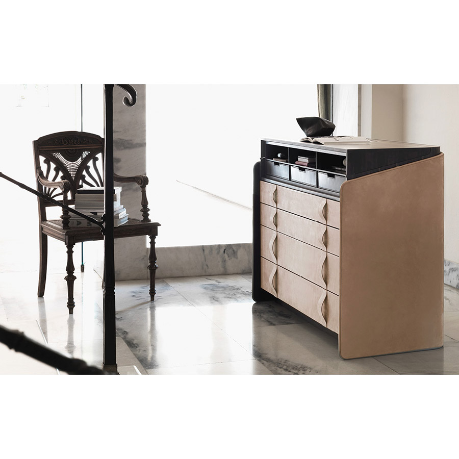 Carlo ColomboThe secretaire – desk with top distinction proportional to the house. The curved multilayer structure is externally covered in leather, with the perimeter edge in tone-on-tone or contrasting leather, and the interior is in ebony (with a matte finish). The top and grille are also ebony, with three removable brown leather trays. Four large drawers, with an automatic return system, have leather fronts and handles.