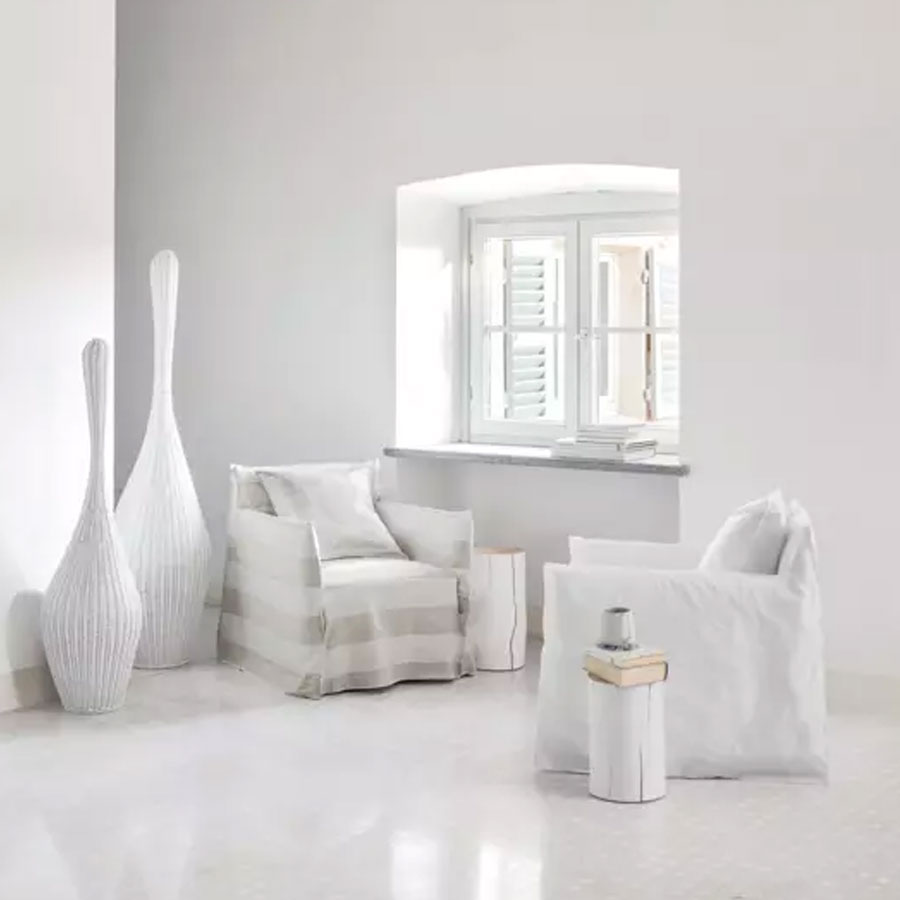 Paola NavoneThe Ghost family armchairs have backrests of different heights and seats of various sizes, they have a minimalist and subtle structure, covered in expanded polyurethane and loose cushions in a mix of feathers. The main feature of the Ghost armchairs is the removable cover, a large cover whose profile is highlighted by visible seams, which allows products to be undressed and re-dressed in an instant. It is a textile design that easily changes the appearance, allowing you to go from an elegant look to a casual one with ease and speed.