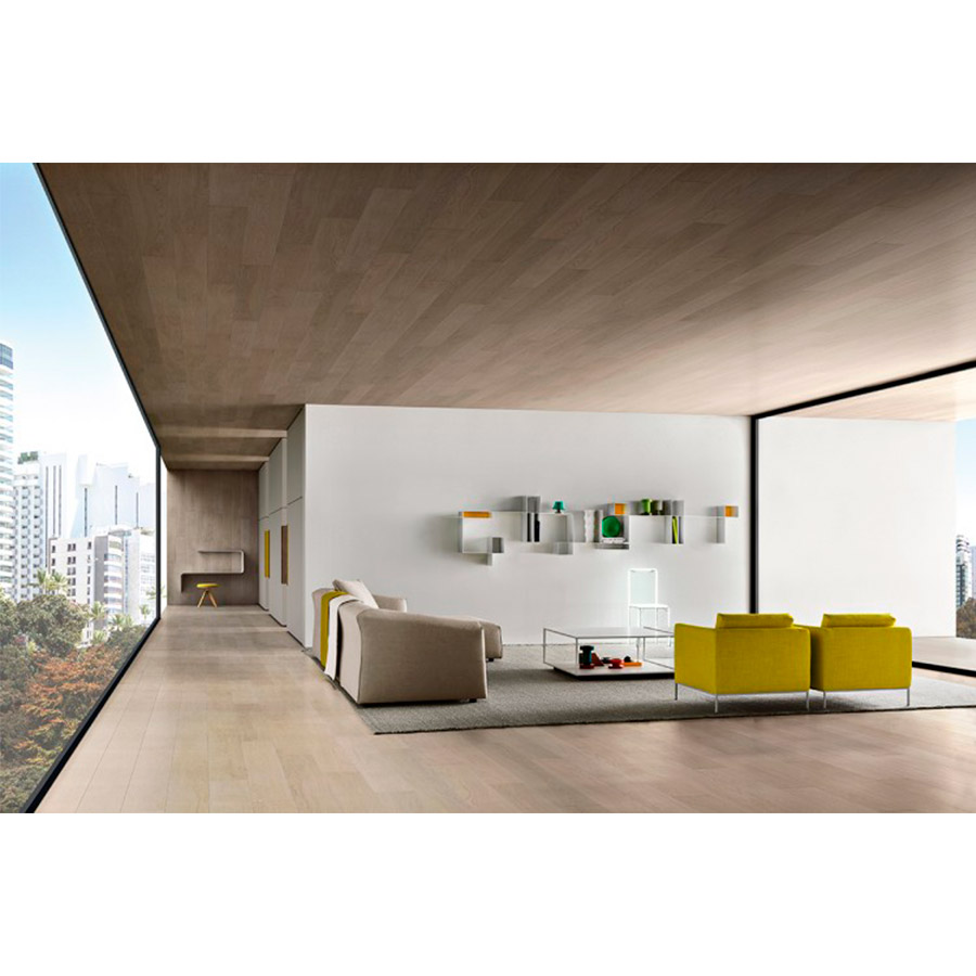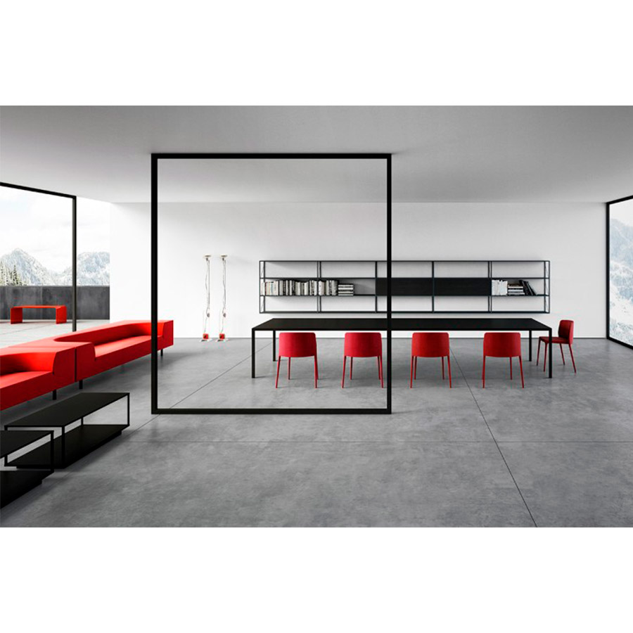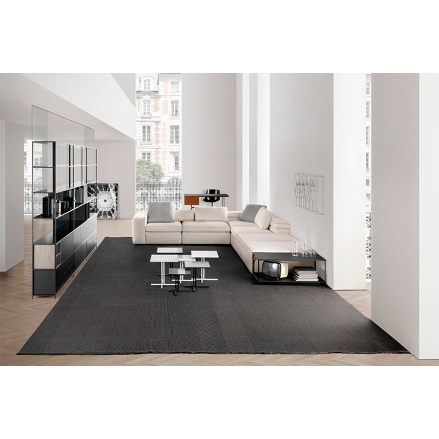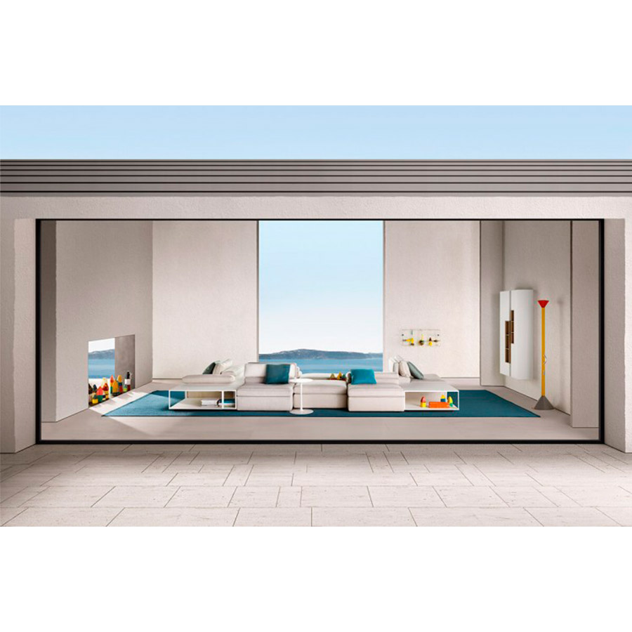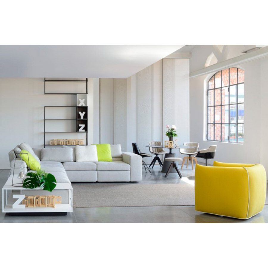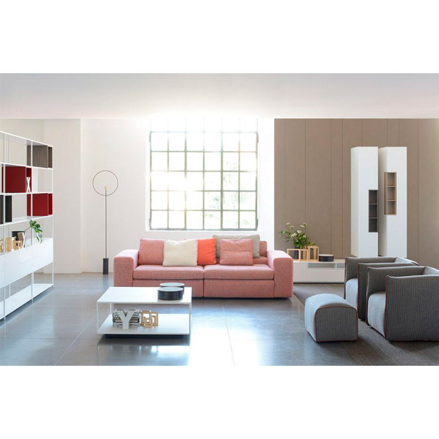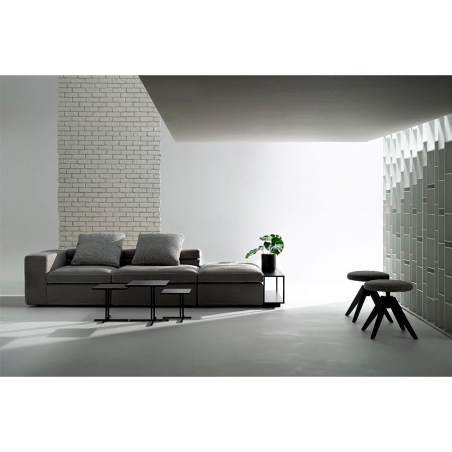 Grafo comes from the designer's desire to provide a soft object with the "identification brand" of the iconic products of the MDF Italy collection. The pure and direct graphic quality, part of the company's philosophy, has been the source of inspiration for the project. Grafo is a modular system. Three sofas, eight upholstered elements, and three complementary coffee tables allow infinite solutions to be developed according to the client's free and creative interpretation. Special seams in contrast at the edges are available in white, medium gray, and anthracite. The folding support integrated into the module guarantees the regulation of height. The system is completed with a wide range of cushions.