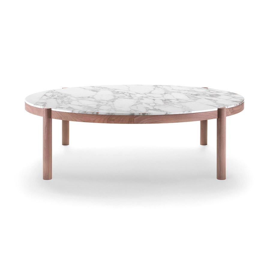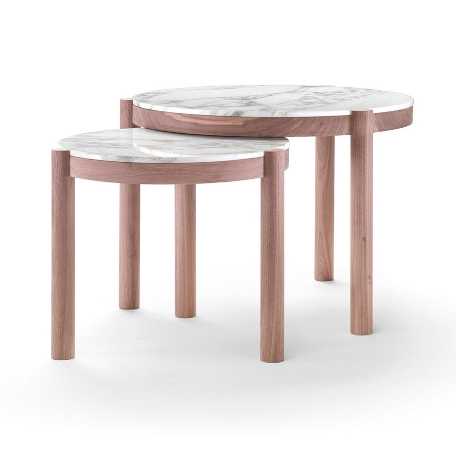 Carlo ColomboA family of tables and coffee tables is characterized by their design’s purity and their probably practical character in use. Sophisticated details, such as the coupling of the leg to the tabletop, hide the complexity of the construction with only apparent simplicity. The combinations of materials between the structure are highly refined, in solid American walnut and ash wood, coupled flush with the top, which can be made in different varieties of marble: white Carrara, Negro Marquina, Calacatta Oro, and Emperador. Conceived as ideal service elements for the seats in the collection, the Gustav tables show their distinctive personality and ability to appear alone or in a group, thus highlighting the game of overlapping.