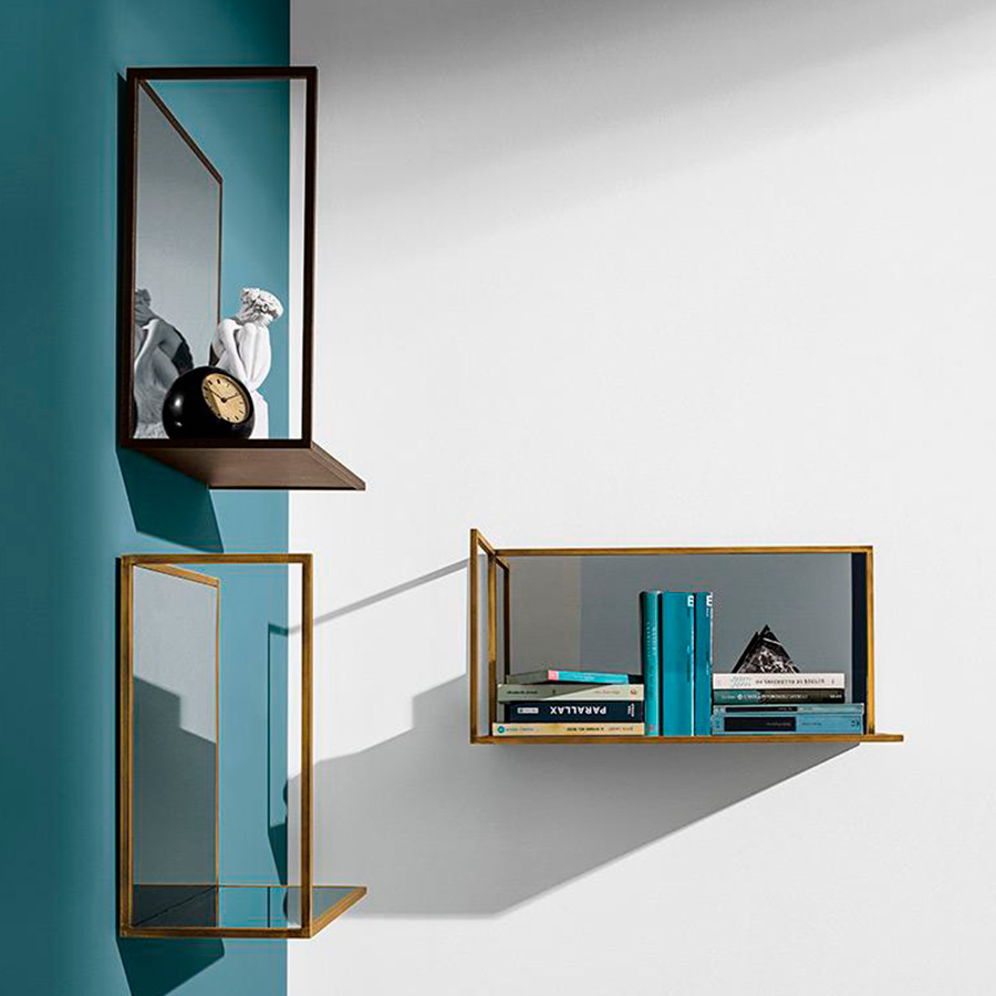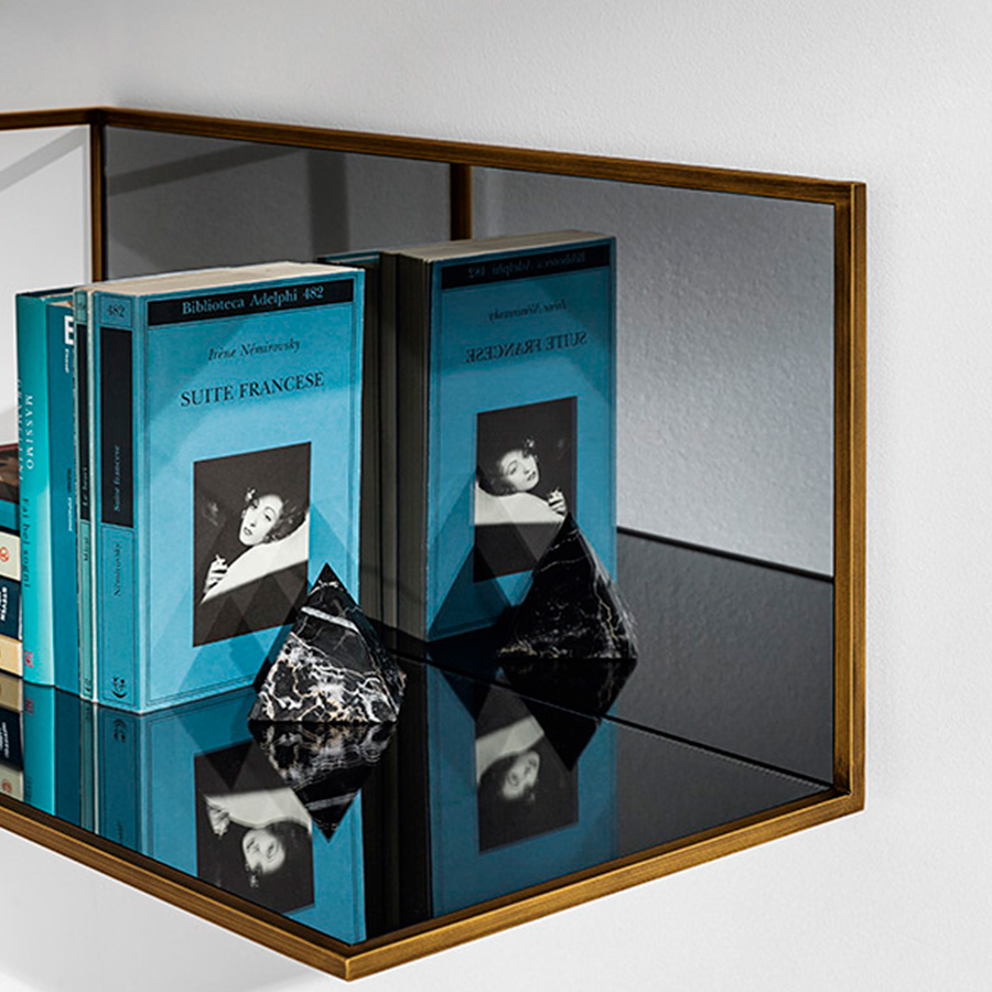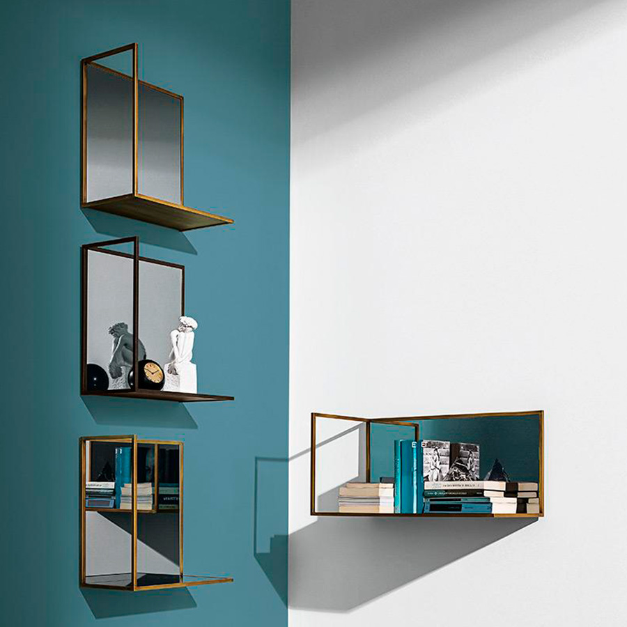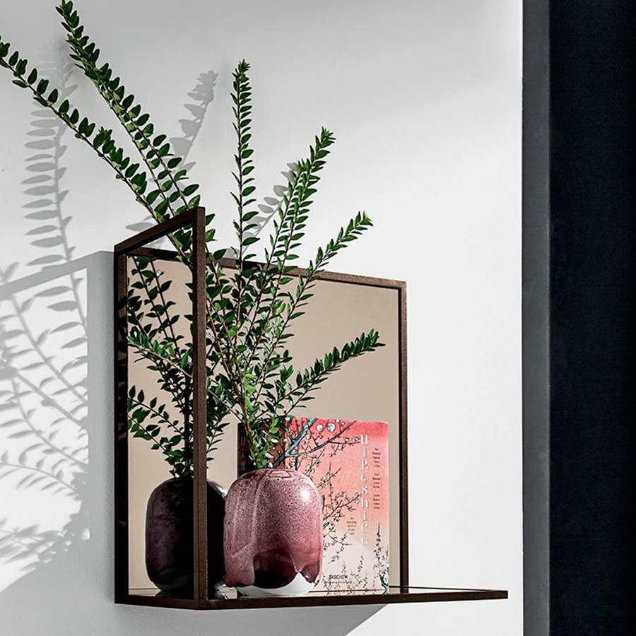 The refined and minimal structure of Helia is enhanced by the shelves in bronze or smoked mirrors to give an exclusive charm to interiors. Both sizes and different widths allow for different uses and combinations.
