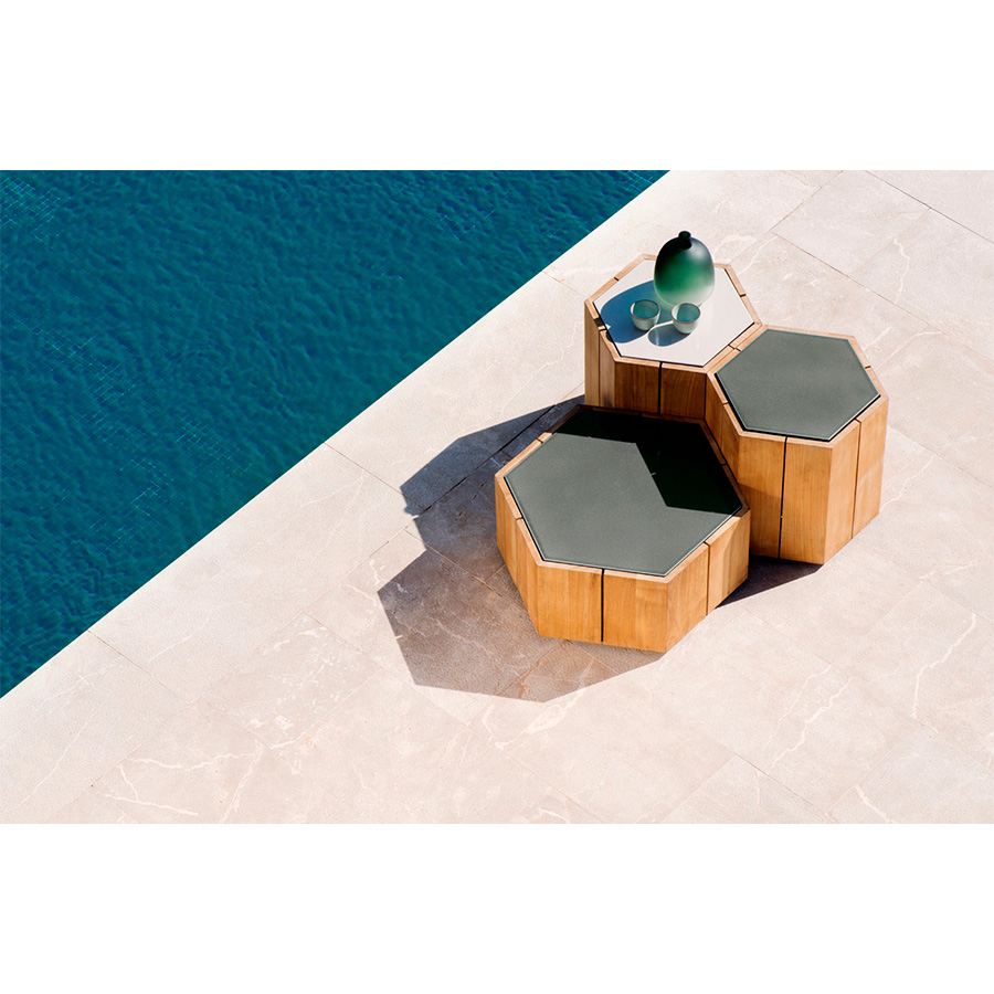 The Hexagon tabletop is made of enameled lava stone, with a crackle effect that highlights the stone’s natural imperfections. The enamel coating makes the table water, heat, frost, UV, and stain-resistant. Hexagon is just as beautiful on its own as part of a group of multiple elements.