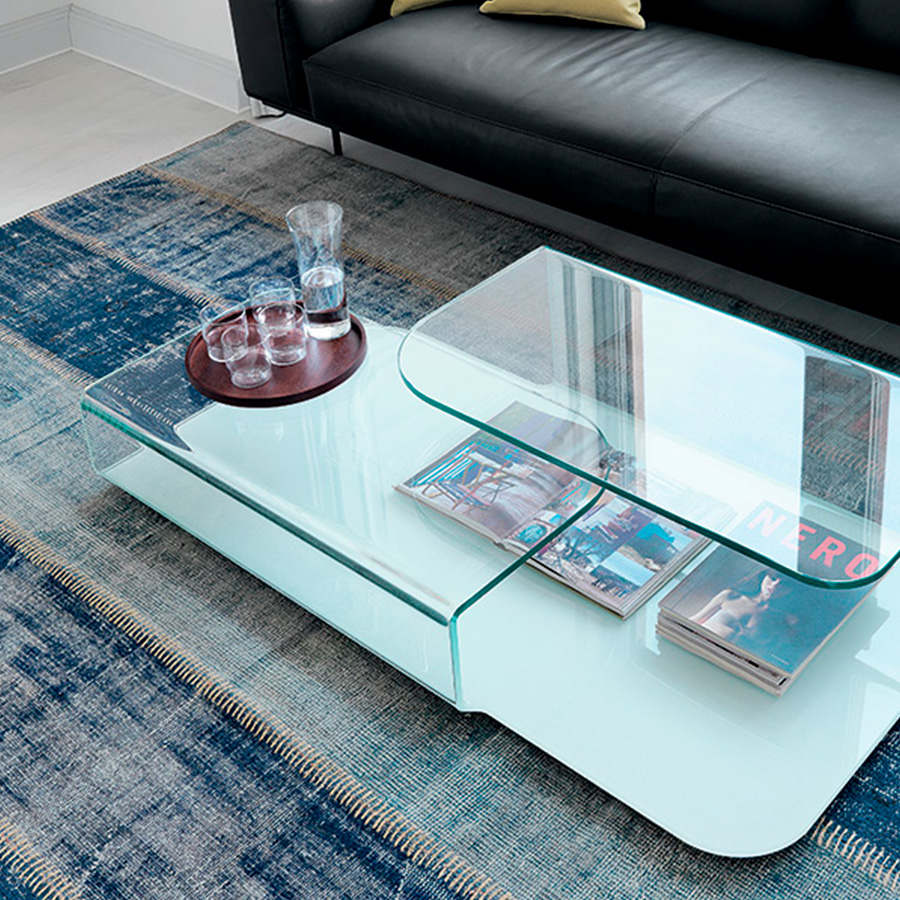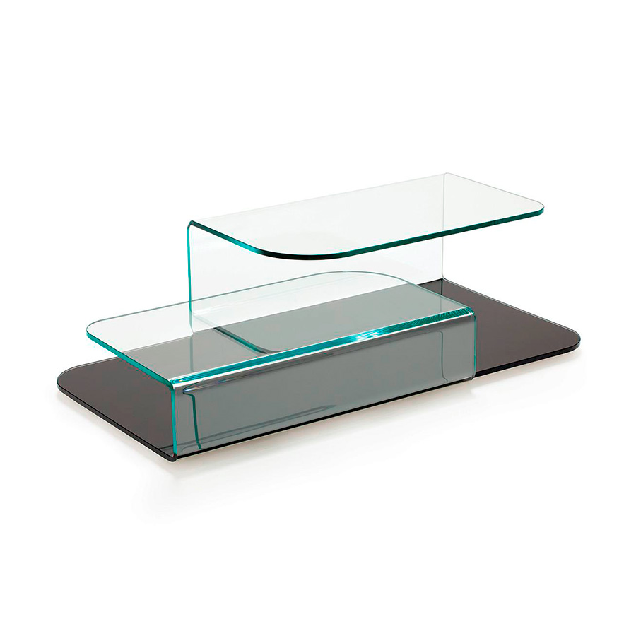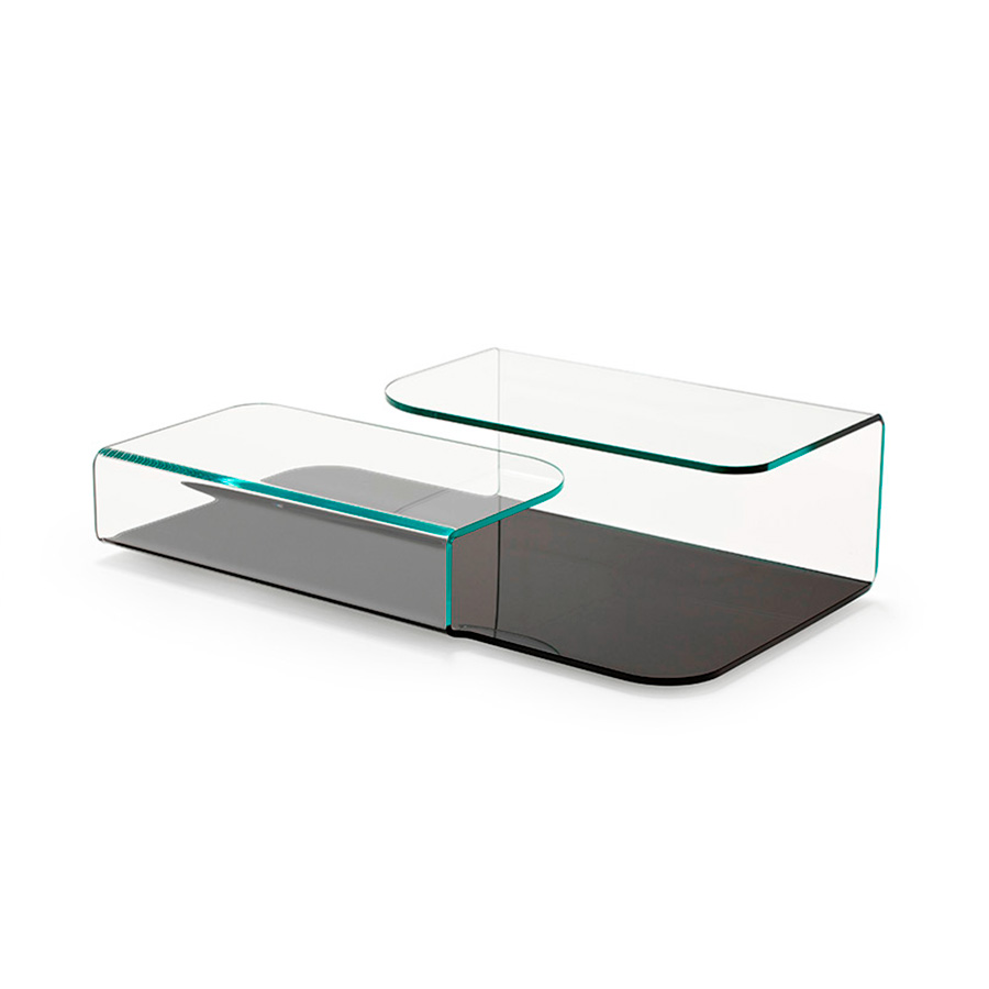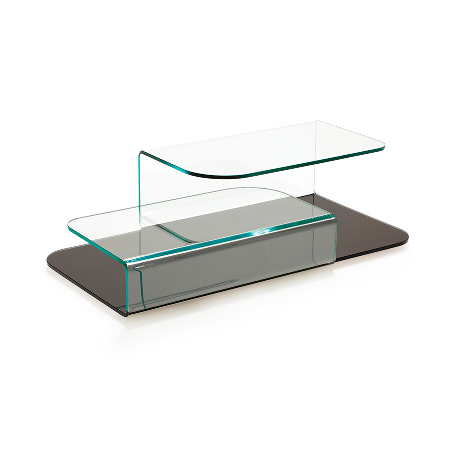 Arkema StudioCoffee table in extra light bent glass, smoked or mono or two-tone lacquered. The Hug coffee table is represented by simple shapes layered on top of each other fluidly.
