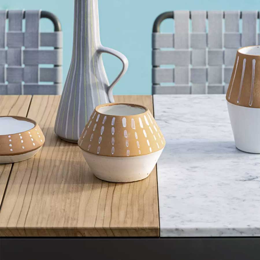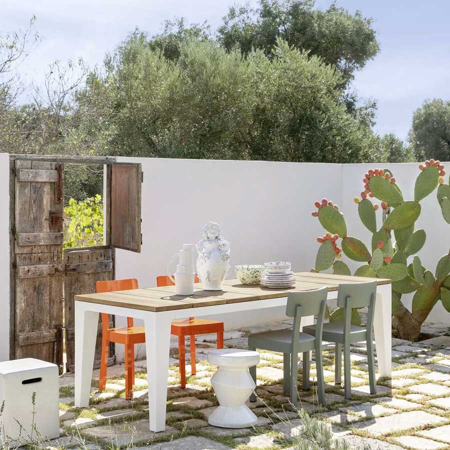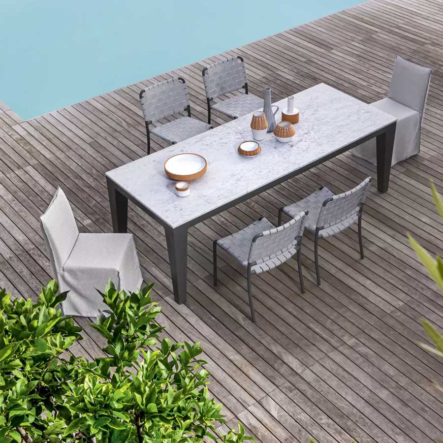 A family of tables that are born from the union of different materials, the Inout 143/144 has a rectangular top and is available in different sizes. Made up of an aluminum structure painted matt white, gray, or sage, they have the top available in different finishes: with natural teak staves, fixed or extendable, in white Carrara marble, fixed or extendable (with teak staves) or gray porcelain stoneware, giving rise to a product of extreme versatility.
