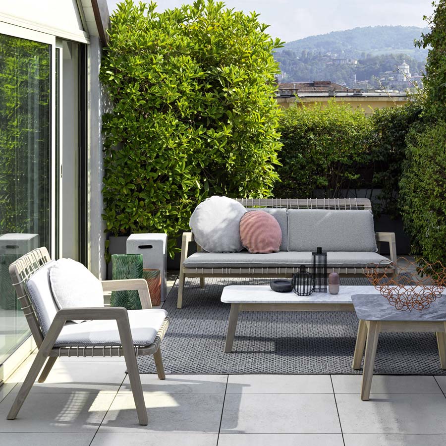 Family of one or two-seater sofas, the Inout 862/863 express refined Nordic essentiality. Its structure is made of washed teak, one of the most precious tropical woods, subjected to an aging treatment that determines the particular gray tone of the surface, which gives the products a delicate appeal. Added to this is a special mesh fabric made of high-intensity polyethylene rope, with soft seat and back cushions with removable covers.