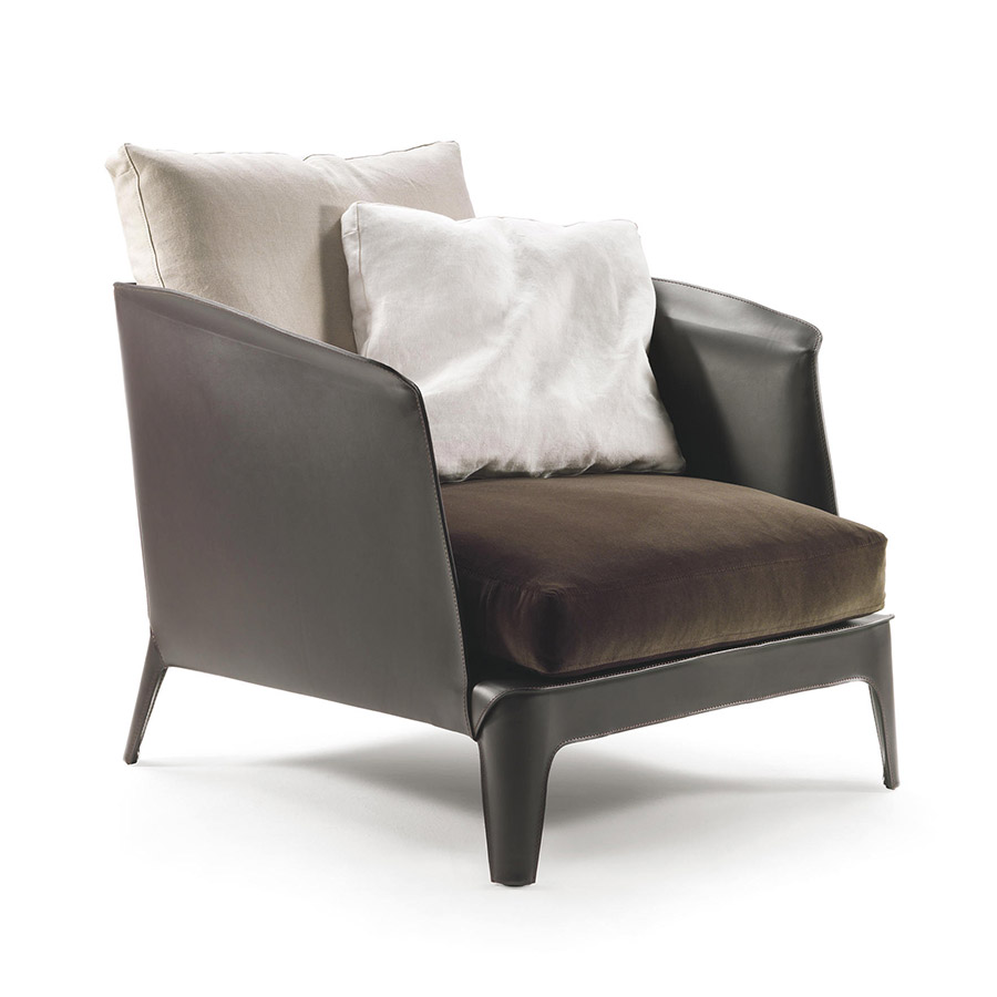 Carlo ColomboIsabel is a refined armchair in which the project is dictated by the intrinsic expressiveness of a noble and versatile material such as leather. The Isabel armchair combines a slender and essential line to the richness of the contents and the preparation. The backrest is made up of a metal shell completely covered in leather that extends to the armrests, opening slightly at the ends, creating a slight fold in the leather, reminiscent of the Japanese art of origami. The Isabel armchair is characterized by a soft elegance. It can be made in all the leather variants and in all the fabrics or leathers of the Flexform collection, chosen in plain tones or contrasting colors to reveal a more decisive personality.