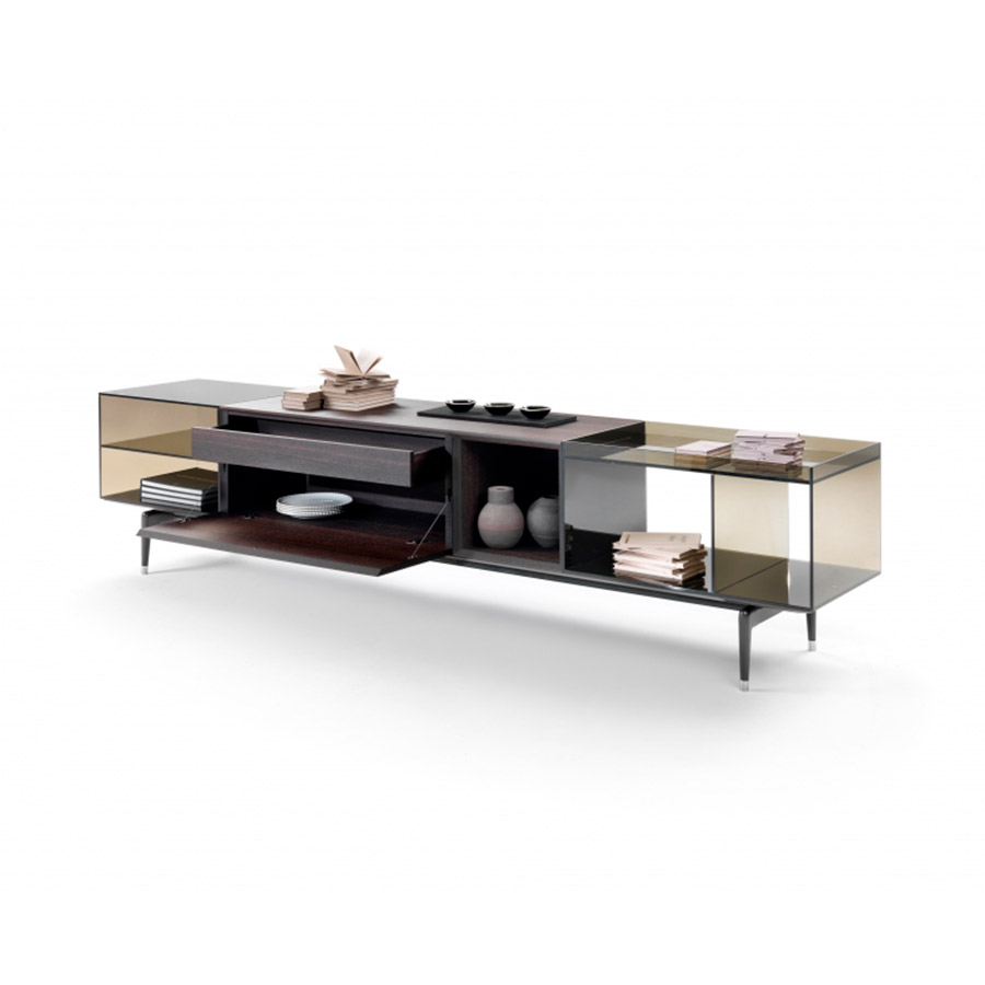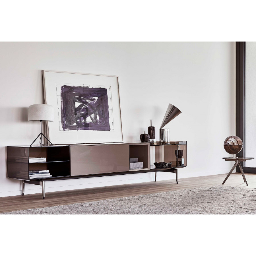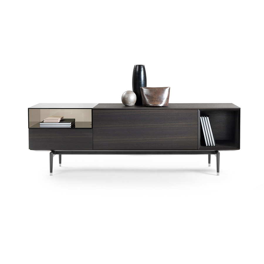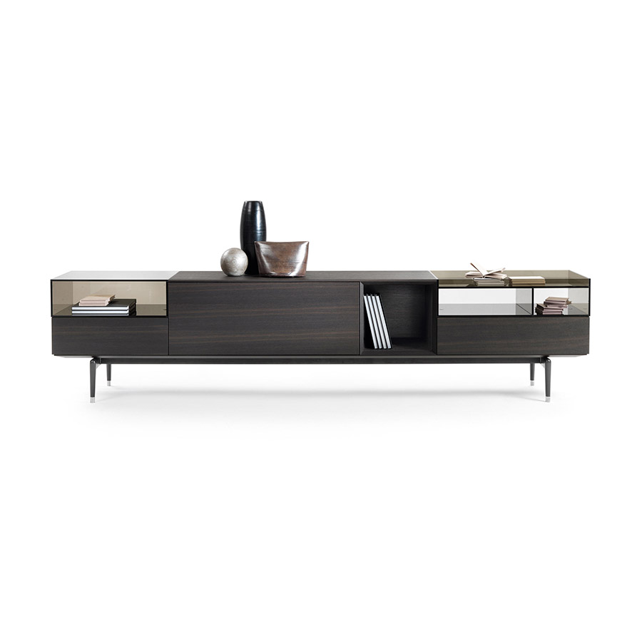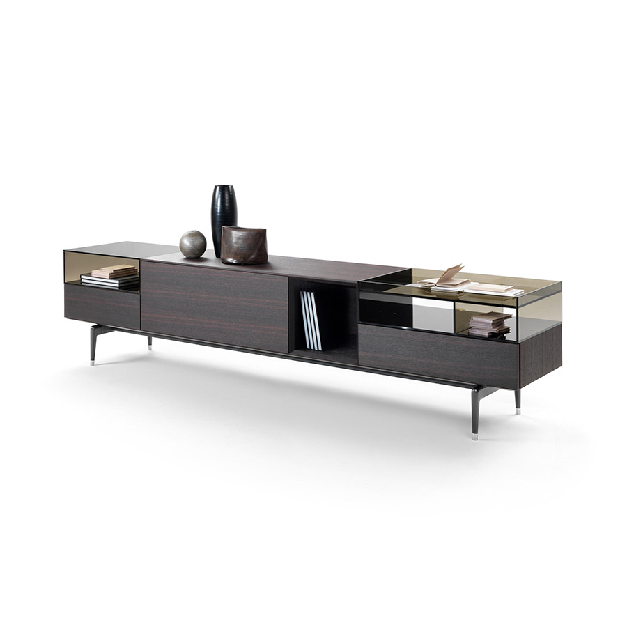 Jeremy storage units are also available in the glossy white, pearl gray, and black lacquered version and rest on refined die-cast aluminum legs available in burnished and satin finishes. The Jeremy storage furniture family includes configurations with drop-down doors and drawers, equipped in different ways, each of which is designed for different spaces in the domestic space: from the interior hall to the living room. All the elements are perfectly finished at the back and can be used to divide spaces.
