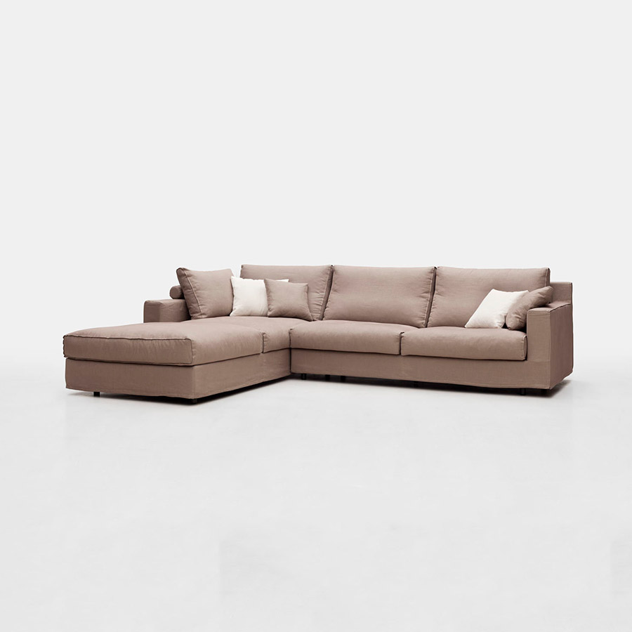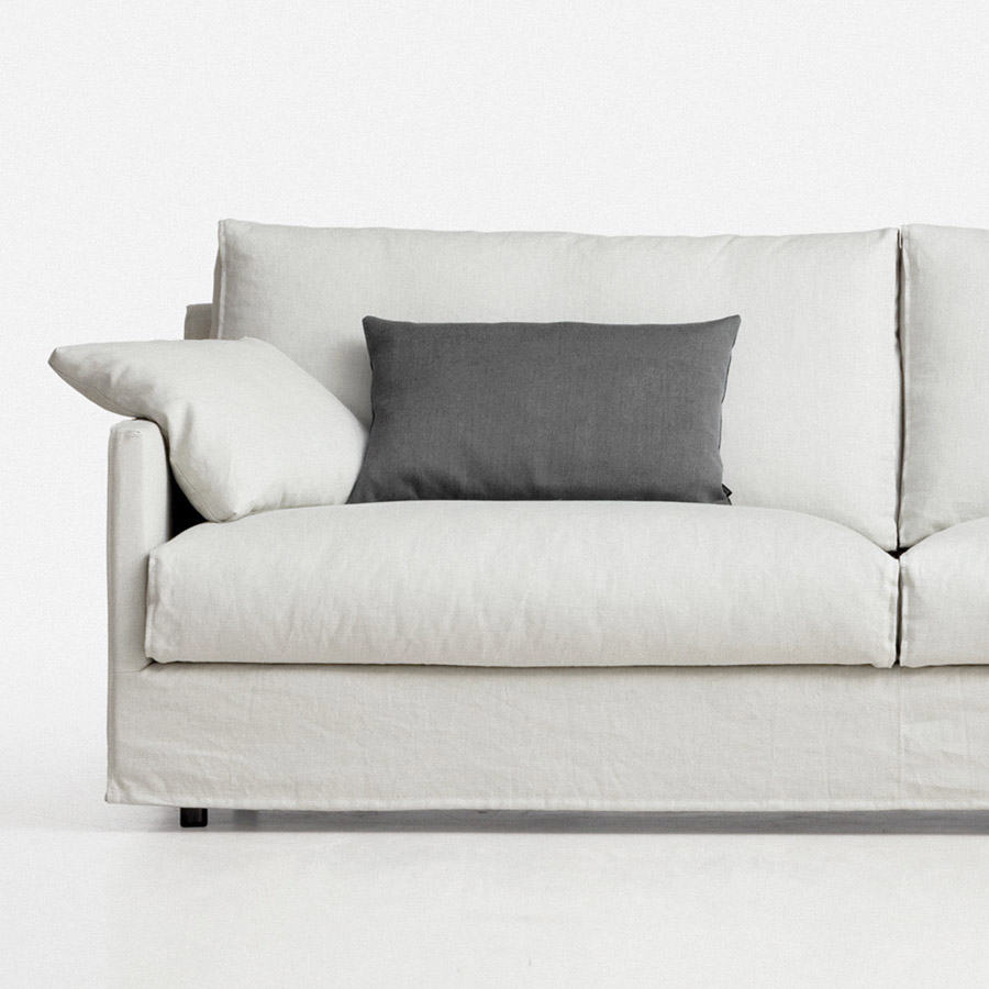 Mario RuizThe June sofa has a relaxed spirit; it has a structure covered by a non-rigid cover that intentionally remains free, giving the fabric a more natural image. It is also manufactured with two arm widths, 6 or 16 cm. Fully removable upholstery. In leather, seat cushions, back cushions, and auxiliary cushions with removable covers.
