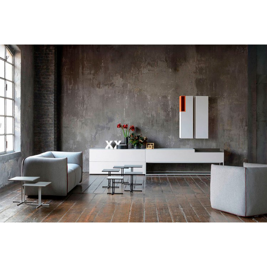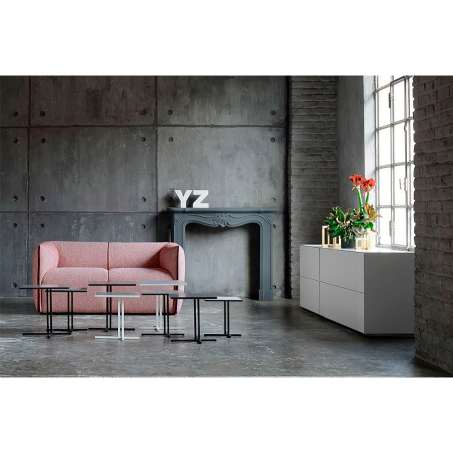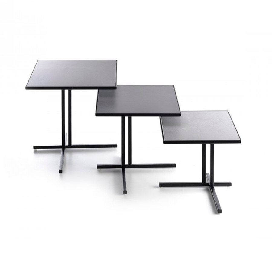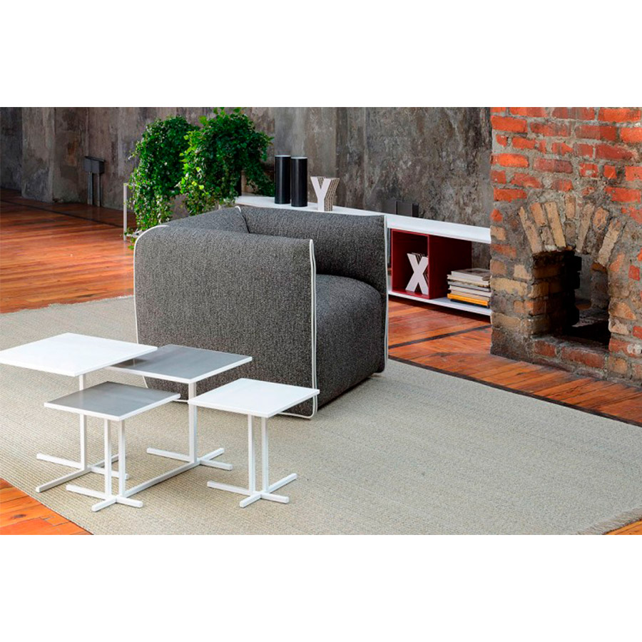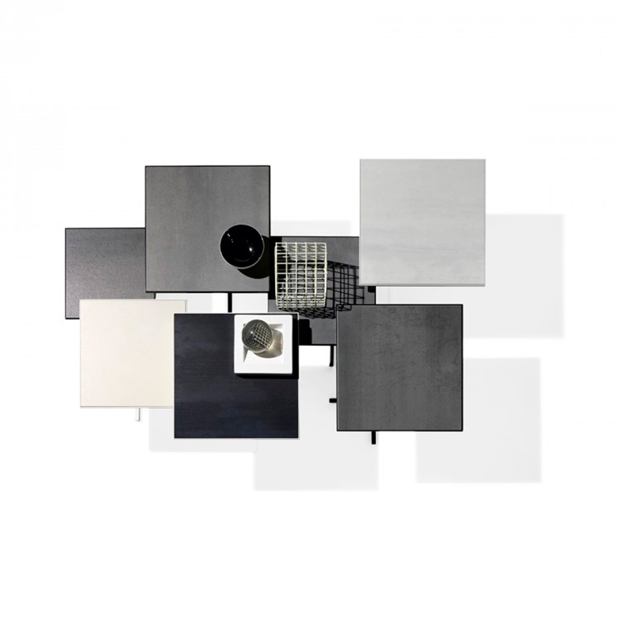 A pleasant game of interconnected elements, which creates an ironic collection. With a simple design, K coffee tables can be included in any context and environment. Different configurations and compositions based on customer creativity can be determined as one piece or grouped. Matte or graphite white painted steel structure. Table boards in Grès porcelain in the versions with satin or satin finish: white, medium, and anthracite gray, as well as the special version Corten.