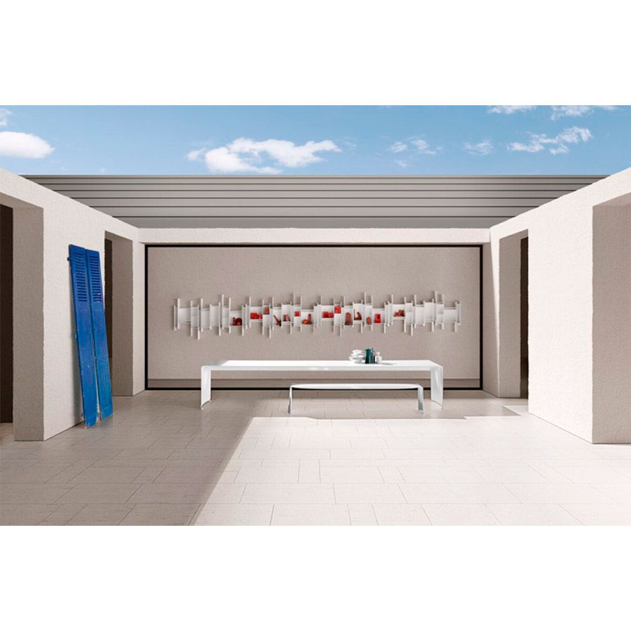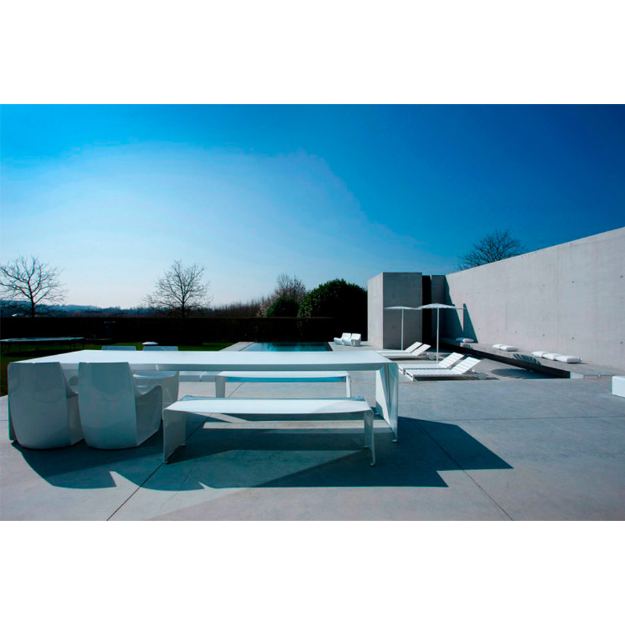 Tables made with a natural aluminum curve sheet. Finish: lacquered aluminum, matt white lacquer, or white shine lacquered.
