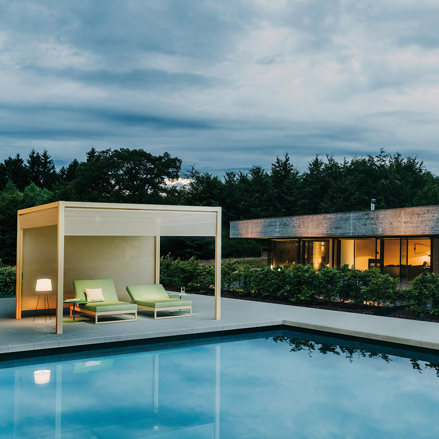 Kettal Landscape designed by Kettal Studio uses modern architectural forms that will enhance the nature of outdoor environments. A complete system is made up of "daybeds", fully configurable pergolas and customizable aluminum furniture that will integrate perfectly into natural environments. The quality of the new structured Natte fabric, the volume and comfort of the clothing as well as the modernity of its proportions give it an elegant appearance.