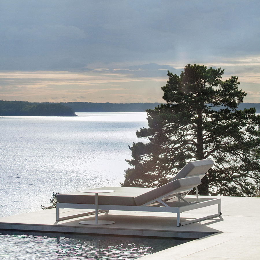 Equipo KettalKettal Landscape Lounger. Stackable for gardens, terraces, or swimming pools, with an aluminum structure and seat and back cushions. It can also be ordered with a headrest cushion.