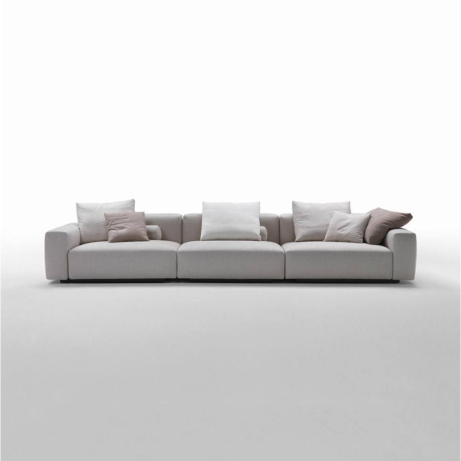 Antonio CitterioLario is an attractive, versatile, and contemporary modular and linear sofa. It is presented as a padded geometric volume resting on the floor that retains a certain aesthetic light thanks to the perfect balance of proportions and the feather cushions resting on the backrest, which is the same height as the armrests. The Lario sofa is available in two depths, 88 cm, and 106 cm, and the variety of elements available makes it possible to create suitable compositions to satisfy the most demanding requirements. The padded armrest is available in the high and low versions and, in addition, the Lario sofa is equipped with another particularly practical optional accessory: a double roller cushion joined by a leather strap that, inserted behind the back cushion, fulfills the double headrest and lumbar support function, to ensure an even more comfortable posture.