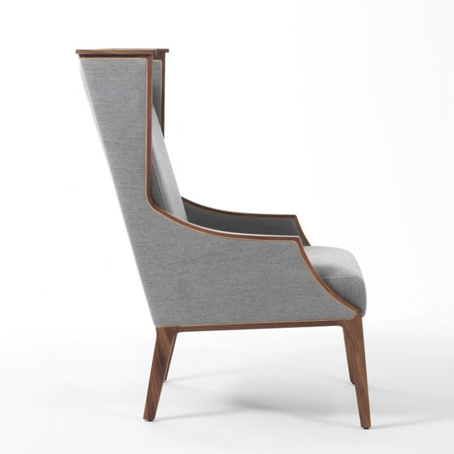 U. AsnagoArmchair with structure in solid canaletta walnut and cover in the fabrics of the collection and upholstered armrests. Solid natural maple insert at the top of the backrest. In the moka-stained version, the insert is barely visible, while it is completely covered in the wenge-stained version.