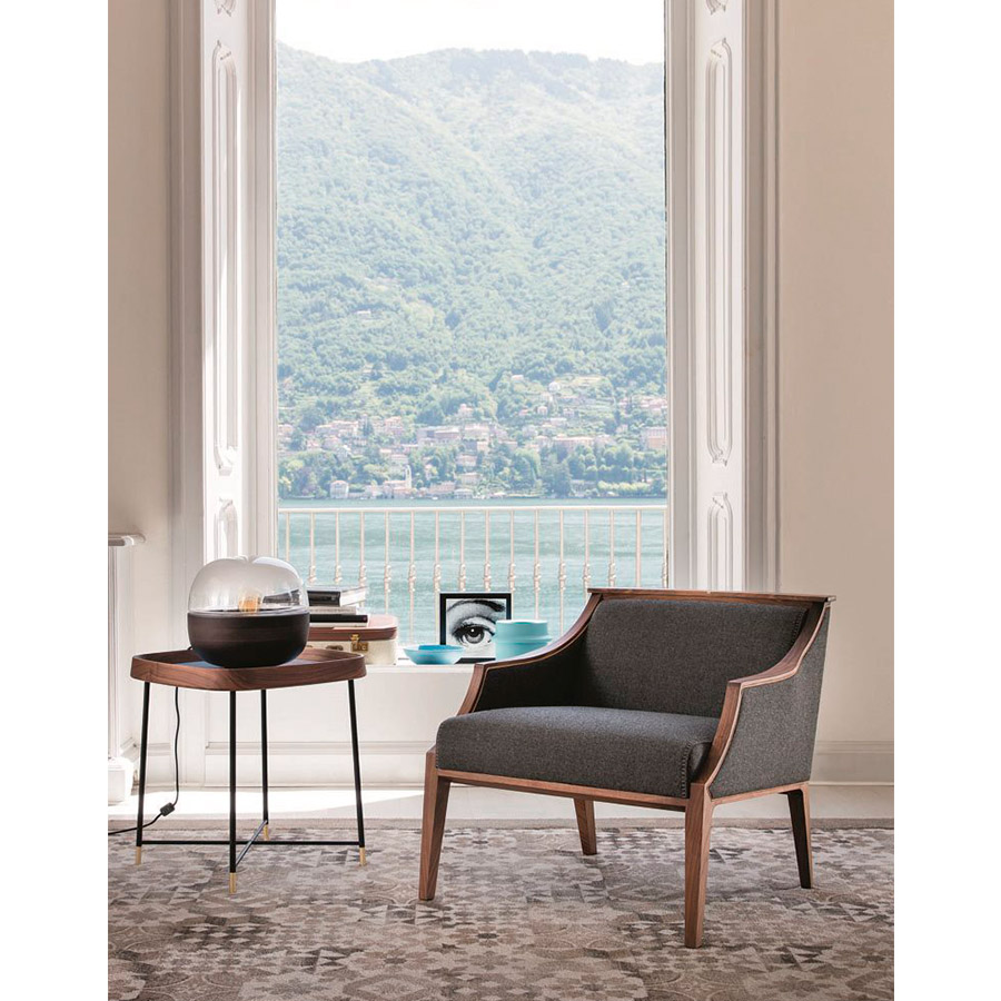 U. AsnagoArmchair with structure in solid canaletta walnut and cover in the fabrics of the collection and upholstered armrests. Solid natural maple insert on the top of the backrest.