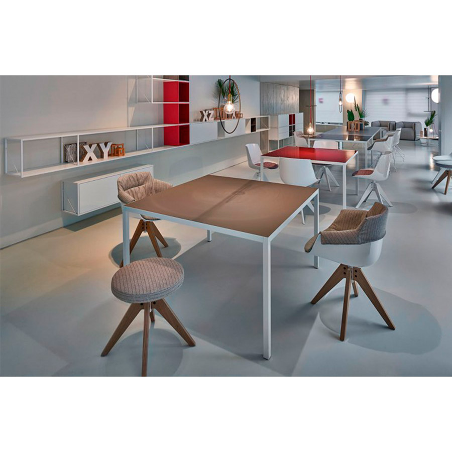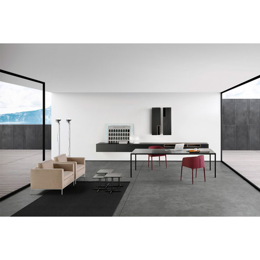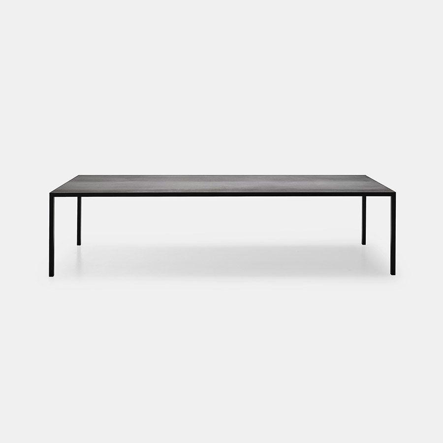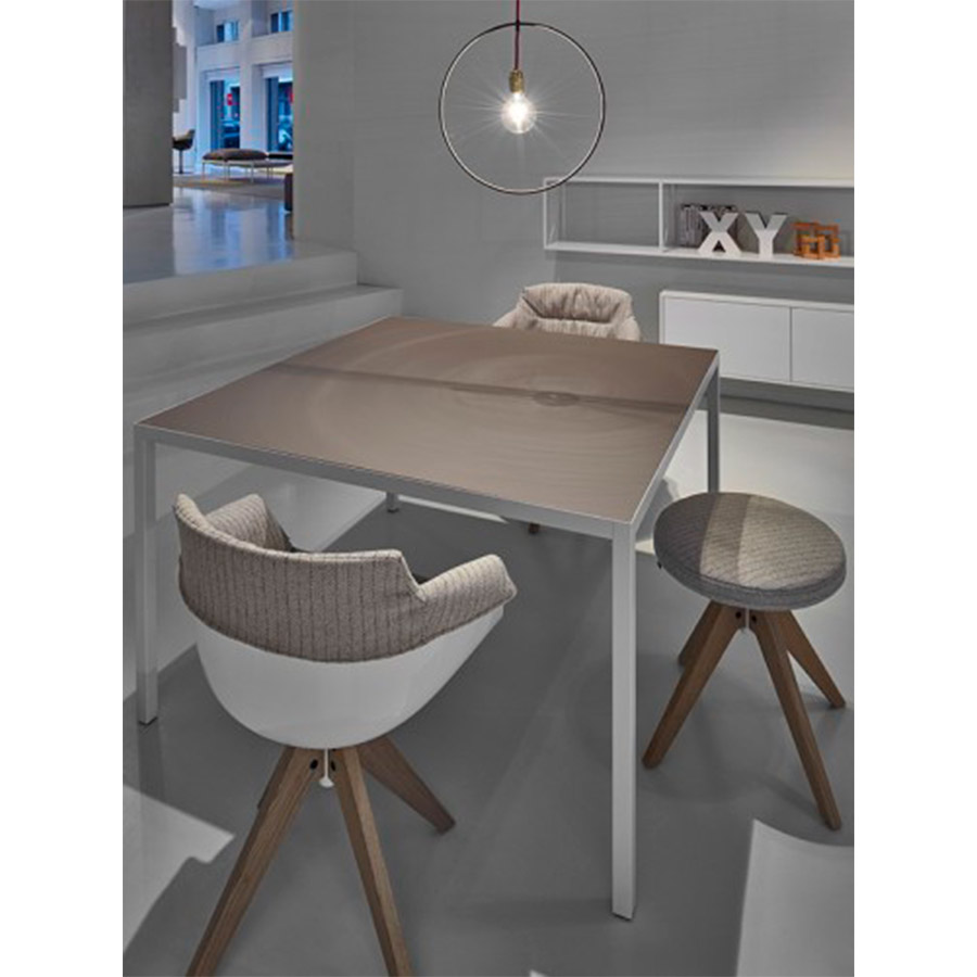 Bruno FattoriniLim 3.0, a change of image of the iconic family of Lim, is renewed and becomes light and thin table with a more updated and modern identity. The structure contained in the sections can receive different materials to offer an alternative option to monochromatism and the structure of a single material. The tapas are integrated into the frame and are available in lacquered tempered glass, ceramics in a brilliant variant or with satin coating, and Fenix, an innovative high-pressure stratified laminate. Extracted aluminum structure, in natural anodized version or mate lacquer in white and graphite gray. Heights 30 cm.