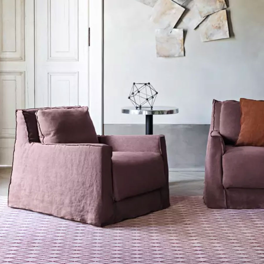 Paola NavoneThe LOLL 01/05 family of armchairs with a solid wood frame covered in high-density expanded polyurethane reflects an idea of contemporary comfort. Soft lines and essential geometries are the hallmark of these armchairs with removable covers, characterized by a large seat cushion, which accentuates the softness of the product, thanks to the soft layer of channeled goose down also present on the backrest.