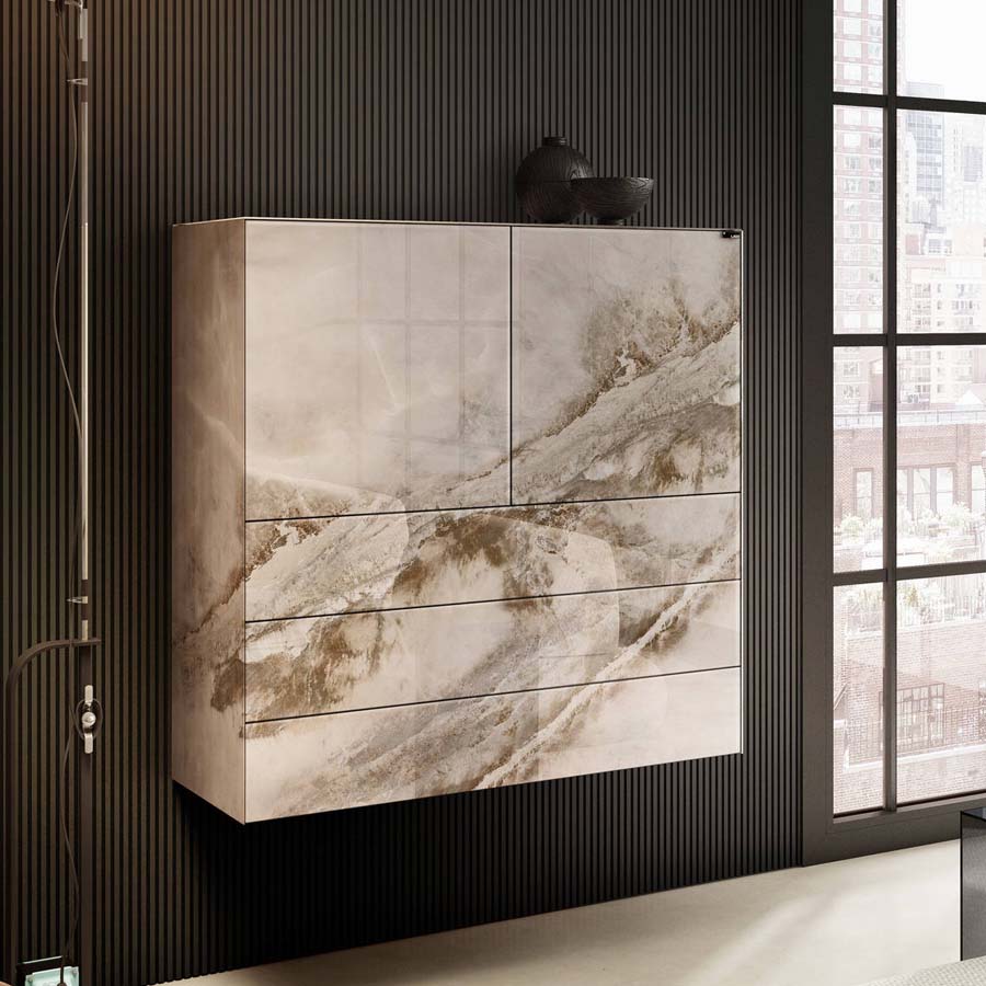 The Materia sideboard has a pure, linear design marked out by 4 mm glass: extremely resistant, it creates a crisp surface finish that brings the unit to life. Whether mounted on the wall or standing on elegant metal supports, this piece is infinitely customisable. Choose from XGlass marble, metal, wood or fabric finishes, which have a continuous grain or pattern to bring out the original natural properties of these materials, in both a matt and polished finish.