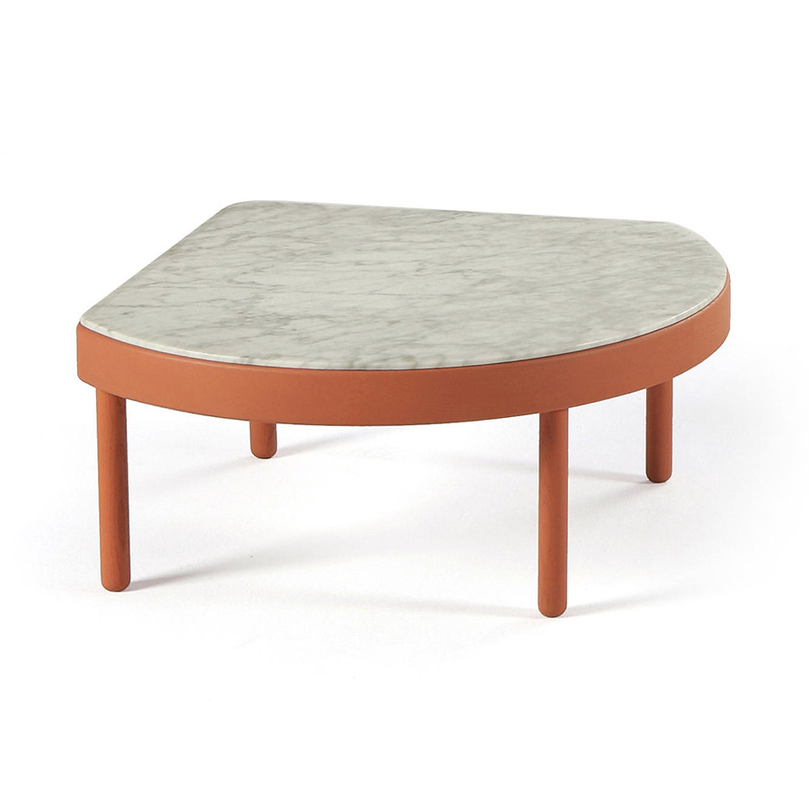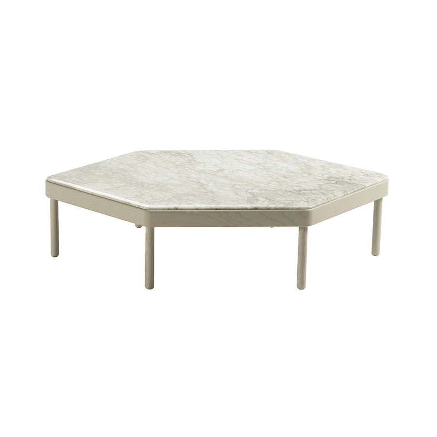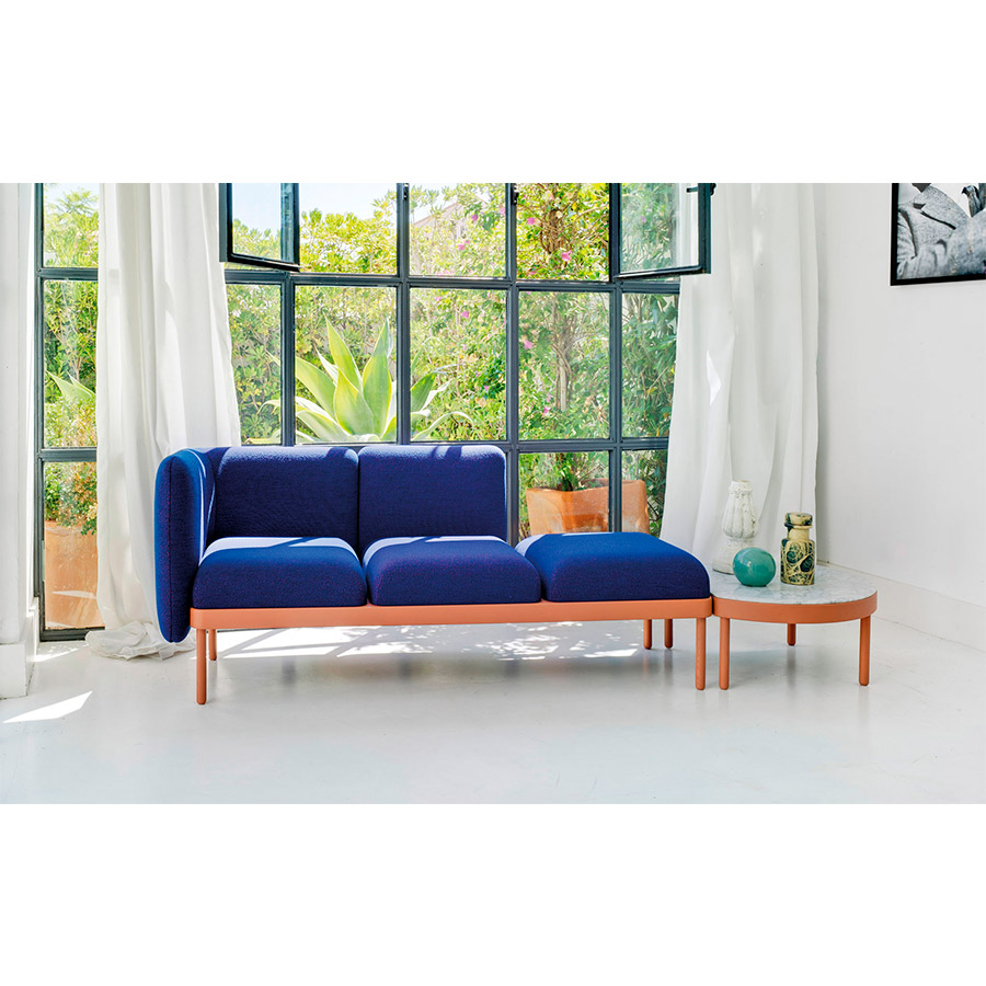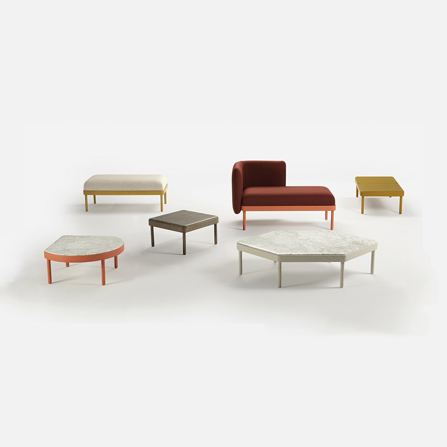 The hexagonal piece allows, among other possibilities, to create 360º compositions. In addition, the corner table brings sinuosity to the design thanks to its curved side.