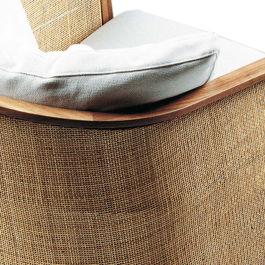 Equipo FlexformMozart is an elegant interior armchair with an exterior charm and vague reminiscences of the colonial era. Its light but robust structure in metal and wood – American walnut and ash in various colors – is distinguished by the use of reed worked on canvas, giving it an unusual grace. Comfort is guaranteed by the generous padding: The seat cushion is made of polyurethane and Dacron, while the back cushion can be Dacron or goose down. Equipped with practical front wheels, the Mozart armchair can easily move.