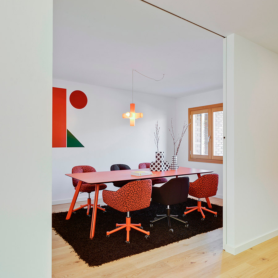 This versatility also resides in the four alternatives for the legs: two options in ash wood, available in all the colors of our stain chart, a variant with a metal rod with a black epoxy finish, and the option with wheels, which is swivel and height-adjustable.