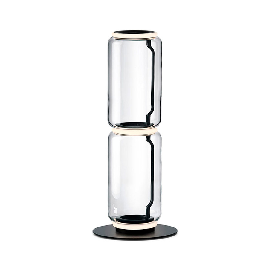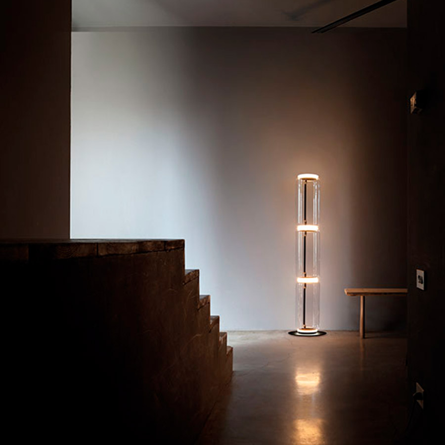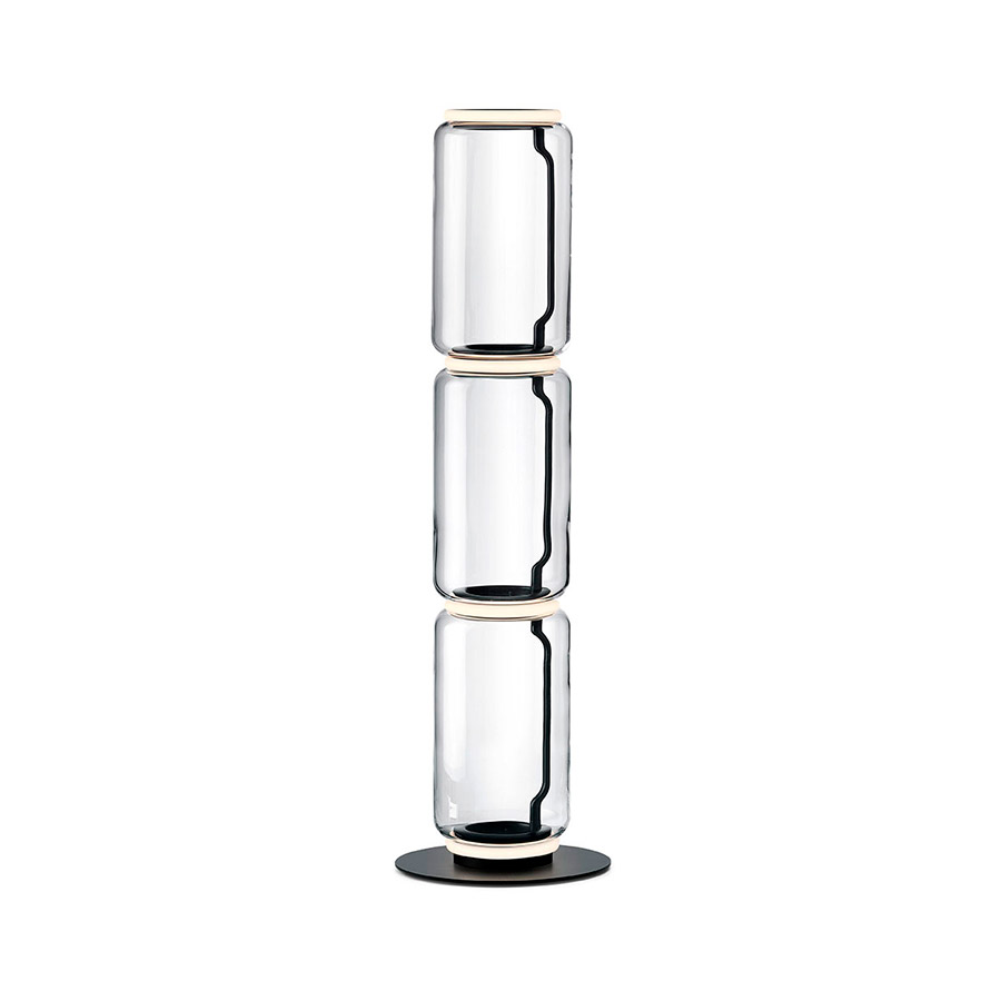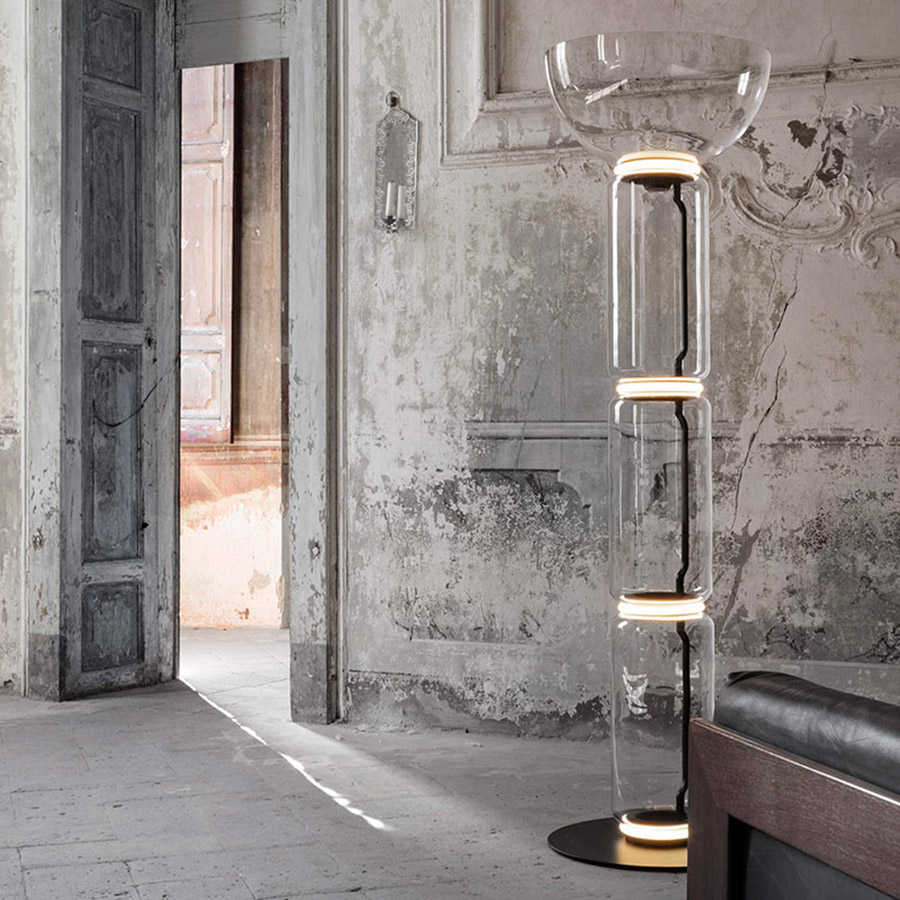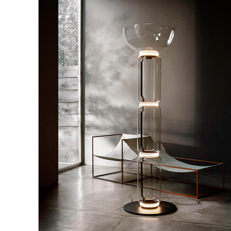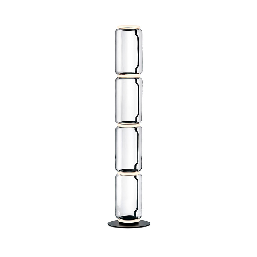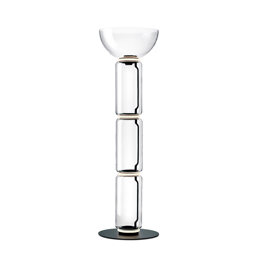 Konstantin GrcicFloor lamps are glass modules connecting to each other up to a height of 2.17 meters (85.43″). Cylindrical body and semi-sphere in transparent blown glass, base, and rings in cast aluminum, internal side arms in steel hydroforming, and external diffusers with injection molded opal optic silicone ring. The length of the power cable is 2 meters (78.74″) with a pedal, which allows the intensity to be adjusted from 10% to 100% and vice versa. Wall power supply with interchangeable plugs.