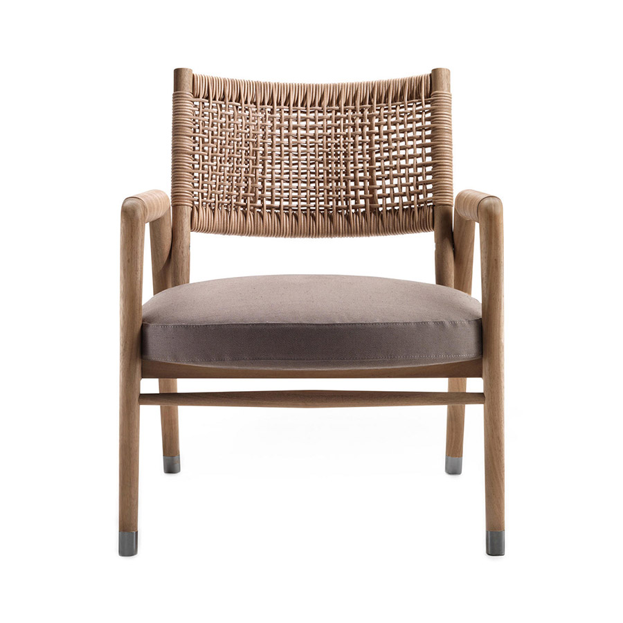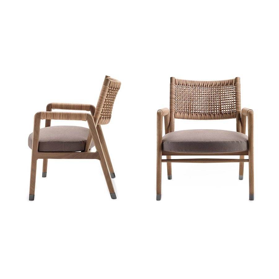 The padded seat can be upholstered in fabric or leather, while the backrest is characterized by a sophisticated woven leather fabric that is entirely handcrafted. The Ortigia family comprises an easy chair with armrests, one without armrests that can be combined with a footrest, and an easy chair for the dining table. Conceived as unique pieces, the Ortigia armchairs can take on a leading role in spaces such as the bedroom or can be easily combined with all the sofas in the Flexform collection to give a touch of sobriety and elegance to any living room.