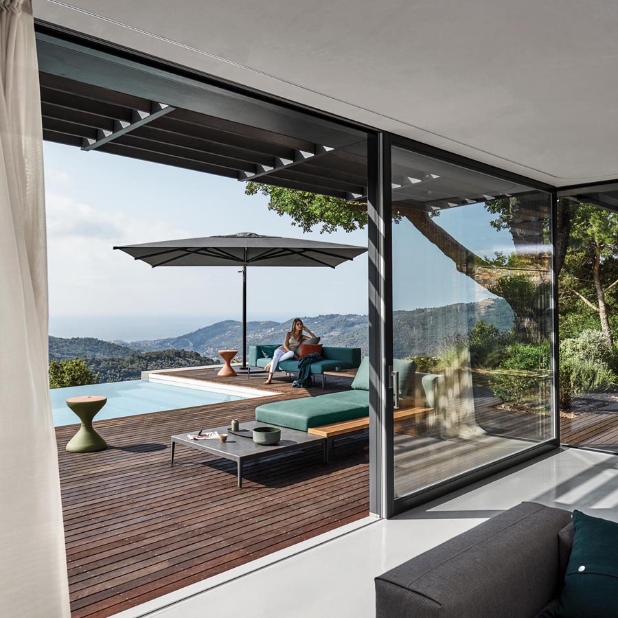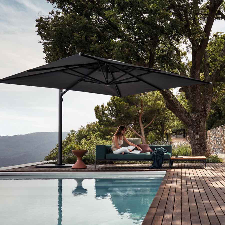 Although we all crave sunlight, shade also has its own unique appeal. The Halo collection of parasols features sturdy aluminum frames and heavy-duty Sunbrella fabric canopies. Available in standard push-up versions and practical cantilever versions, with Halo, there is always a place to cool off and get away from the midday sun.